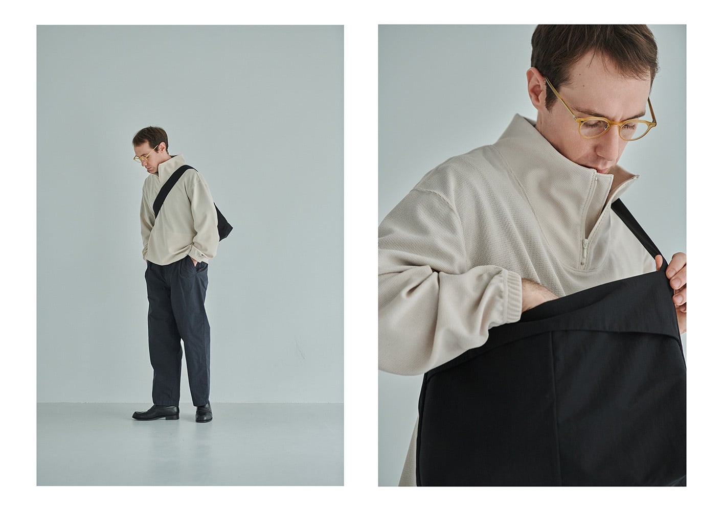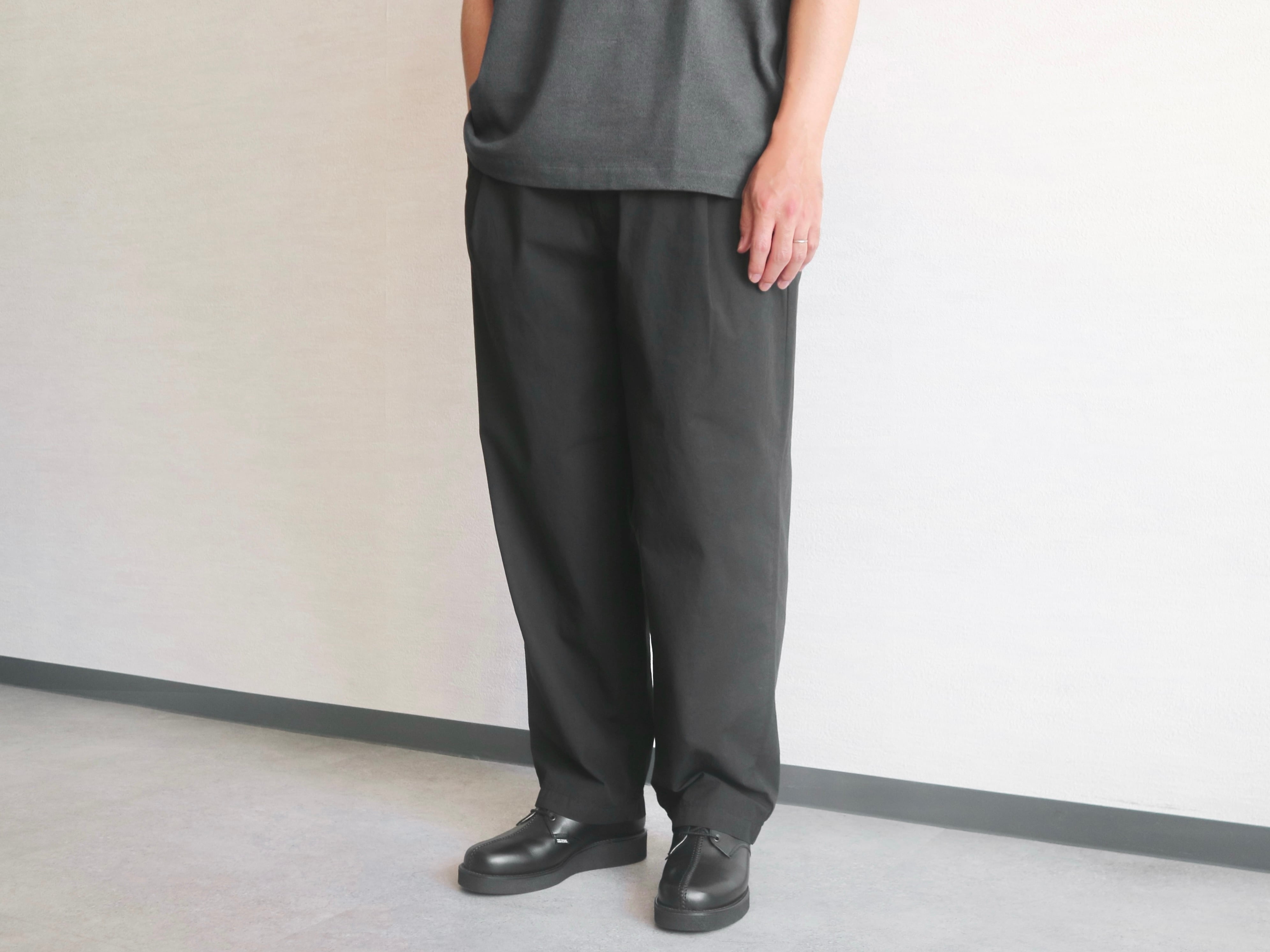 深いタックを取ることで腰回りに程良くボリュームが生まれ、膝下から裾にかけてテーパードを効かせることで、リラックス感のある洗練されたシルエットとなります。