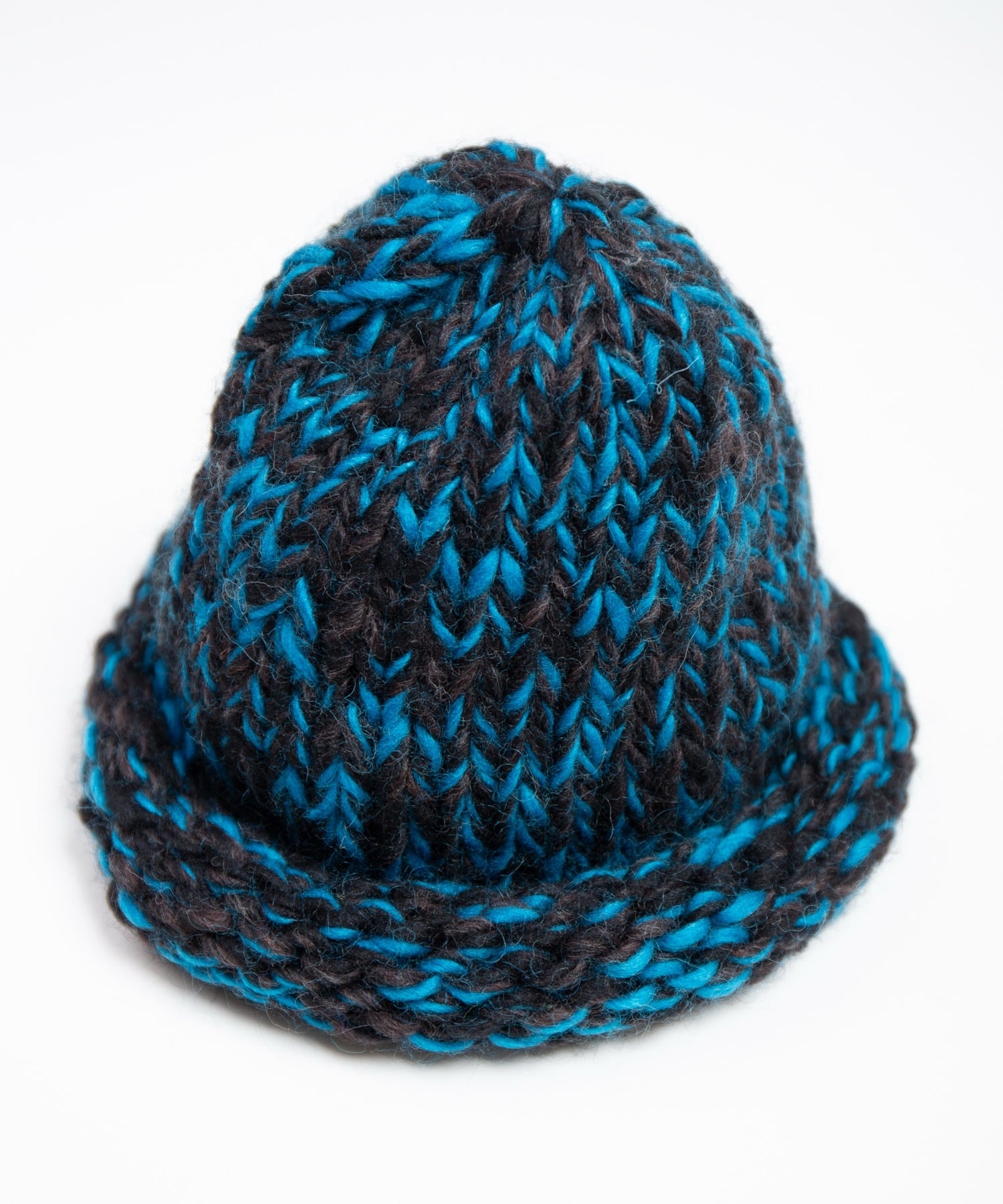ウール糸で編み立てたハンドメイドのニットキャップ。