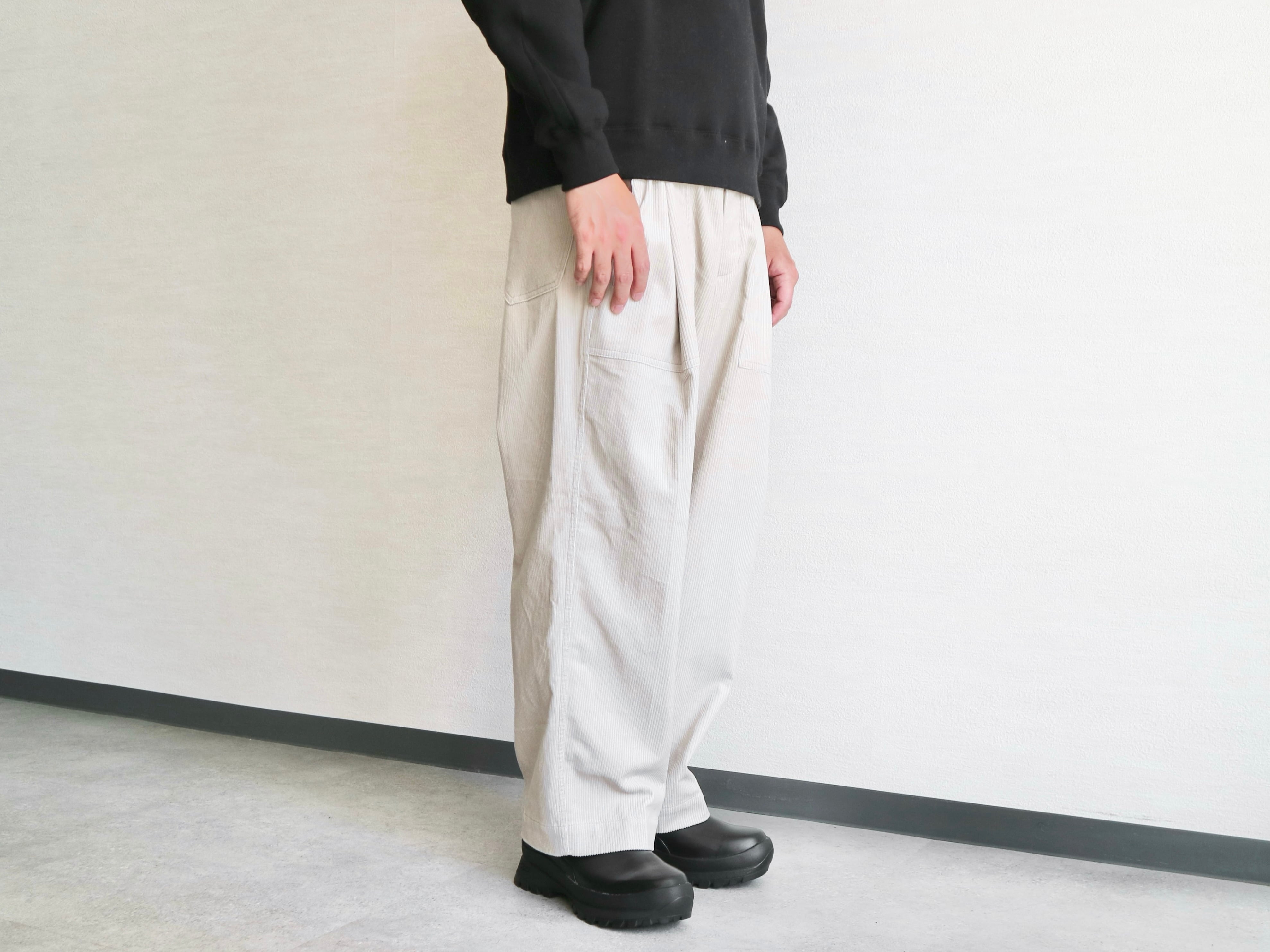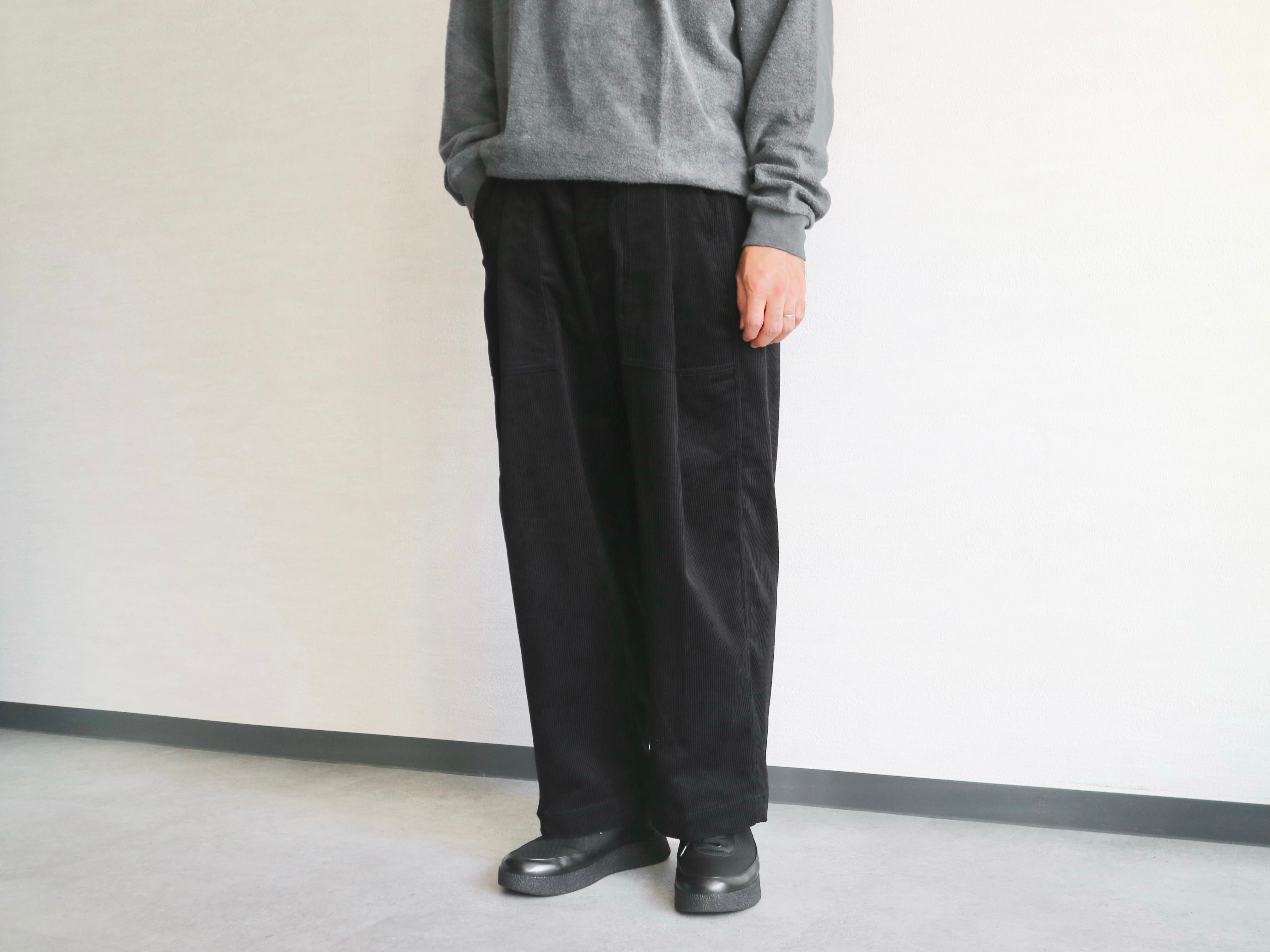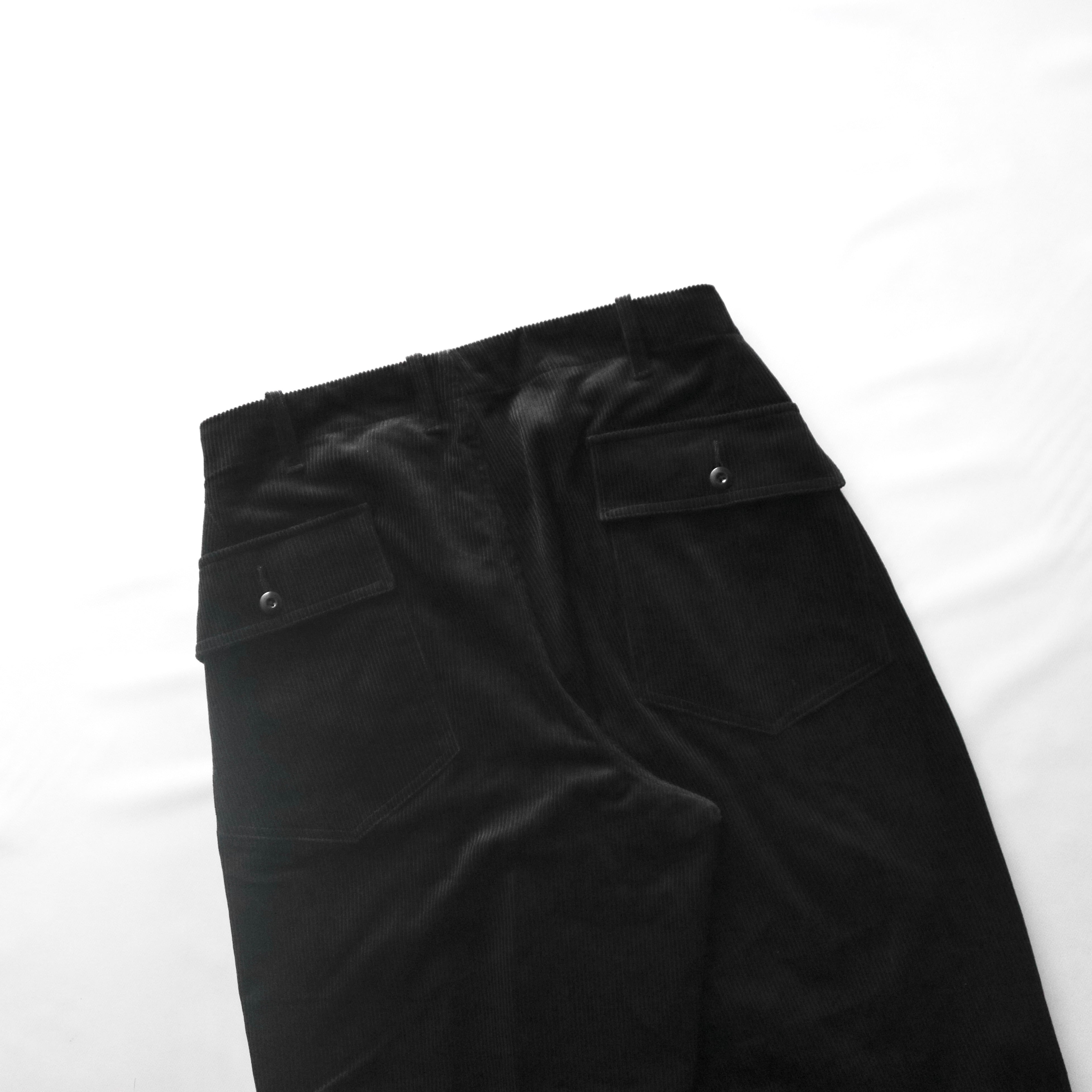 硫化染めを施した8ウェールの中肉コーデュロイを使用したユーティリティーパンツ。
