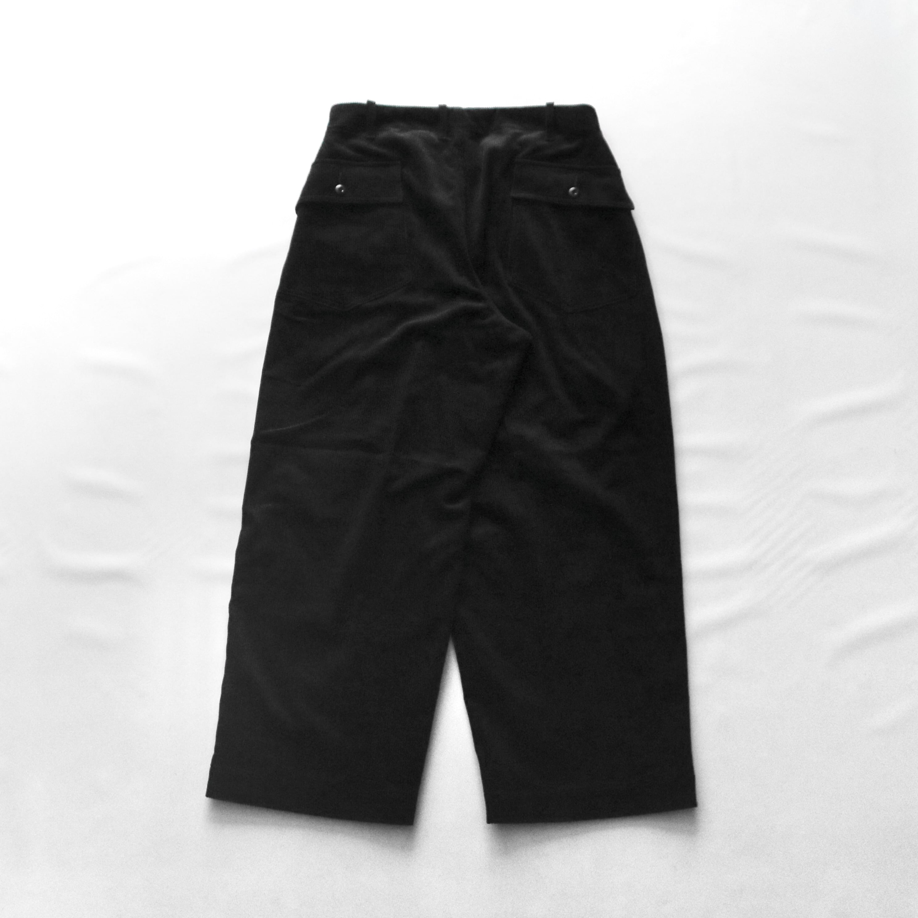 ミリタリーやワークウェアであるオーバーサイズのユーティリティーパンツをベースに、サイドシームを前身側に移動し、フロントには深いプリーツを施し、後身にゆとりをもたせたワイドシルエットにデザインしています。