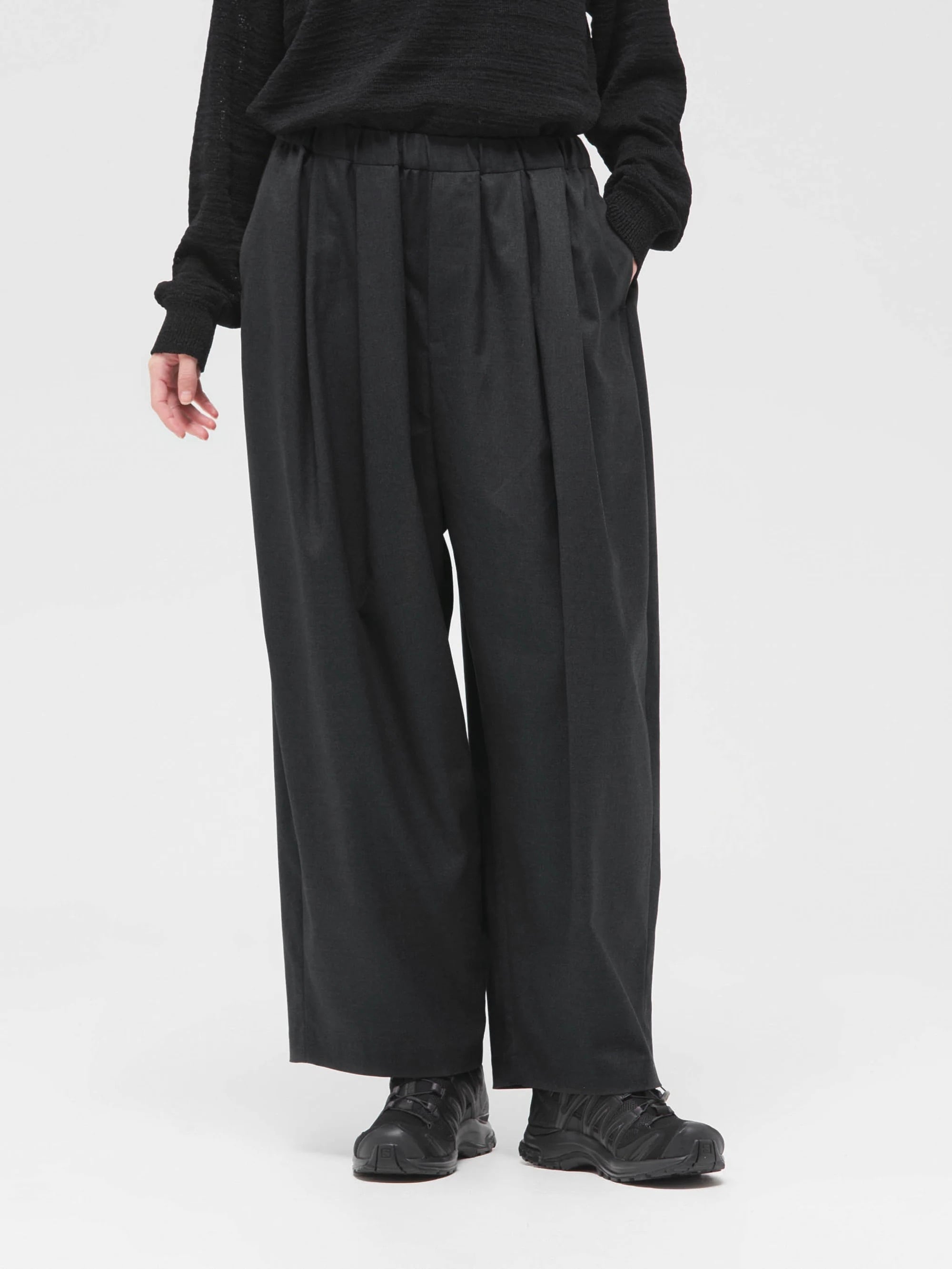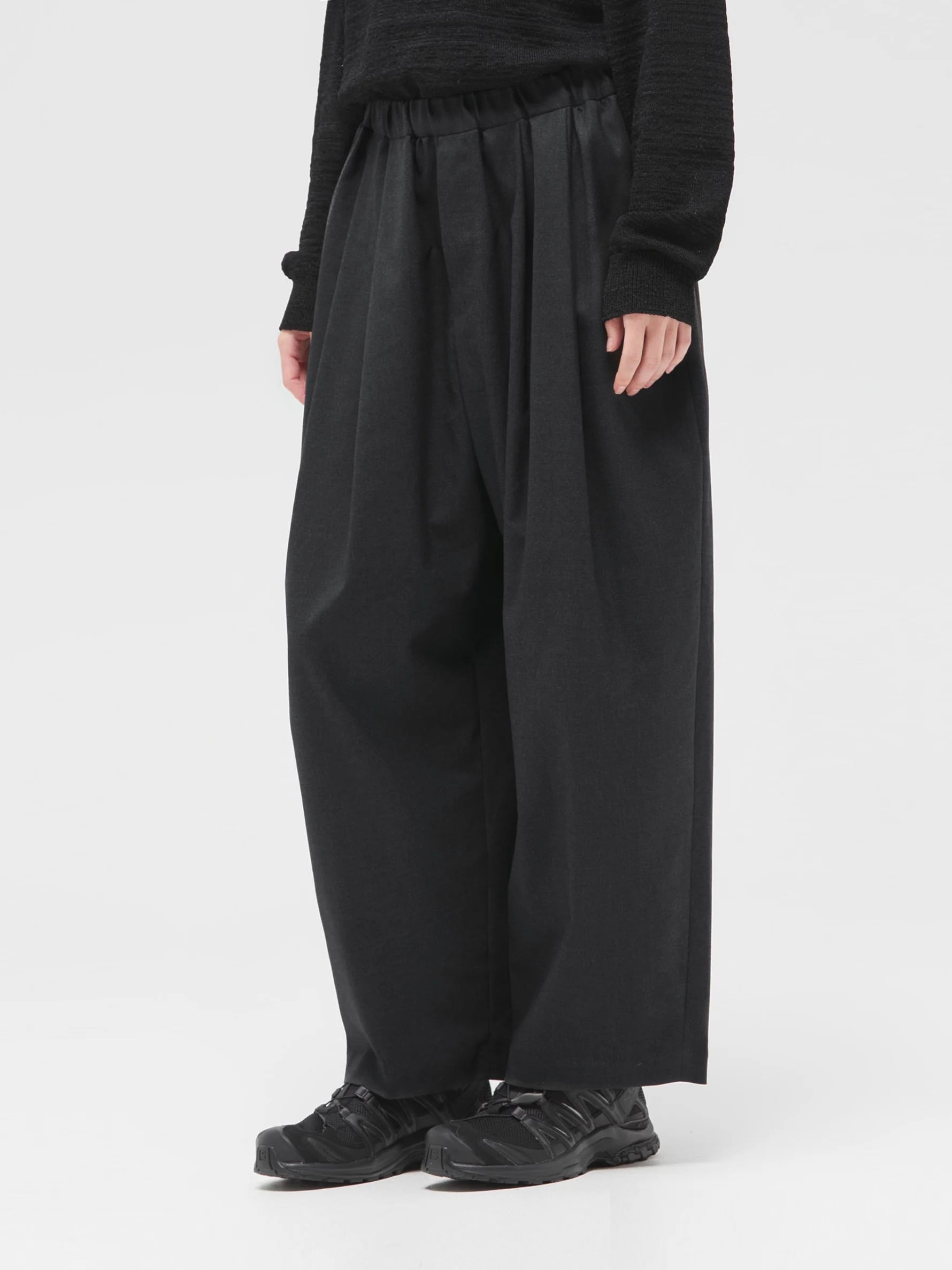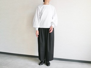 前後に施したギャザータックが生み出す丸みのあるシルエットが特徴的なワイドパンツ。
