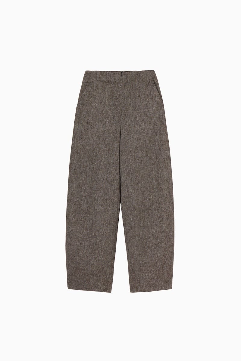 シルクネップが織りなす独特の艶感が魅力のリサイクルウールを使用したツイード素材で仕立てたコクーンパンツ。