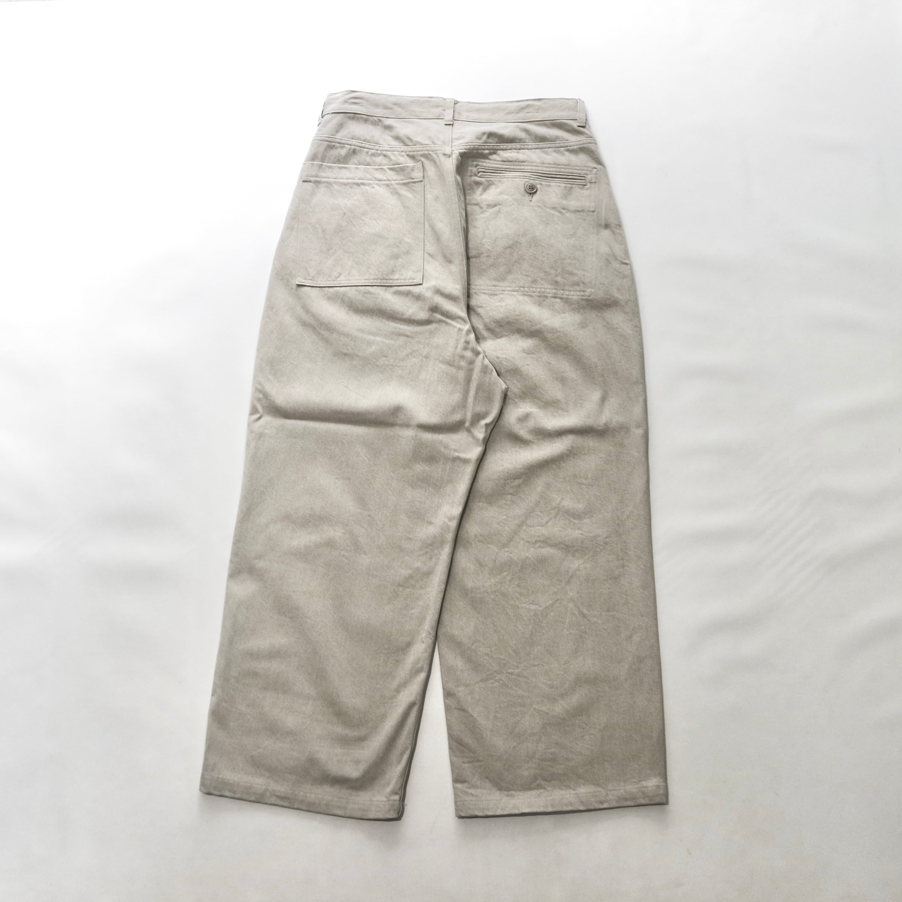 ポケットの形状、プリーツなどのディテールが特徴的で、膝から下にかけてテーパードをかけずに直線的なシルエットとなります。