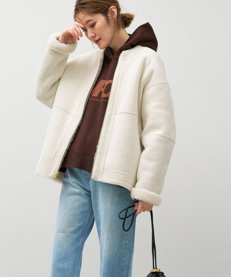 毛足の異なるボアを袖とウエスト辺りで切り替えた表情感のある見た目になっており、スエード面を表にすると、袖口からボアが覗くところもデザインポイントとなります。