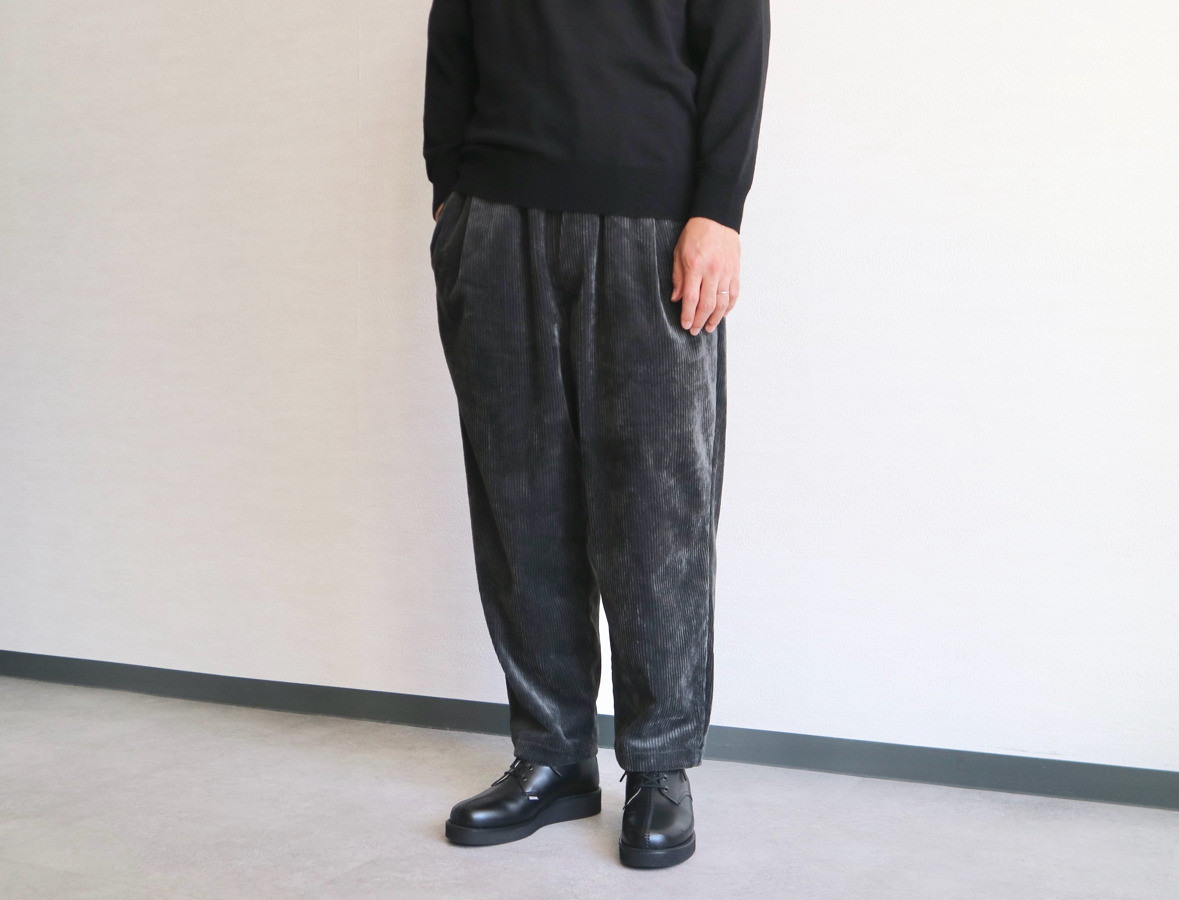 コーデュロイ生地を使用したタックテーパードイージーパンツ。