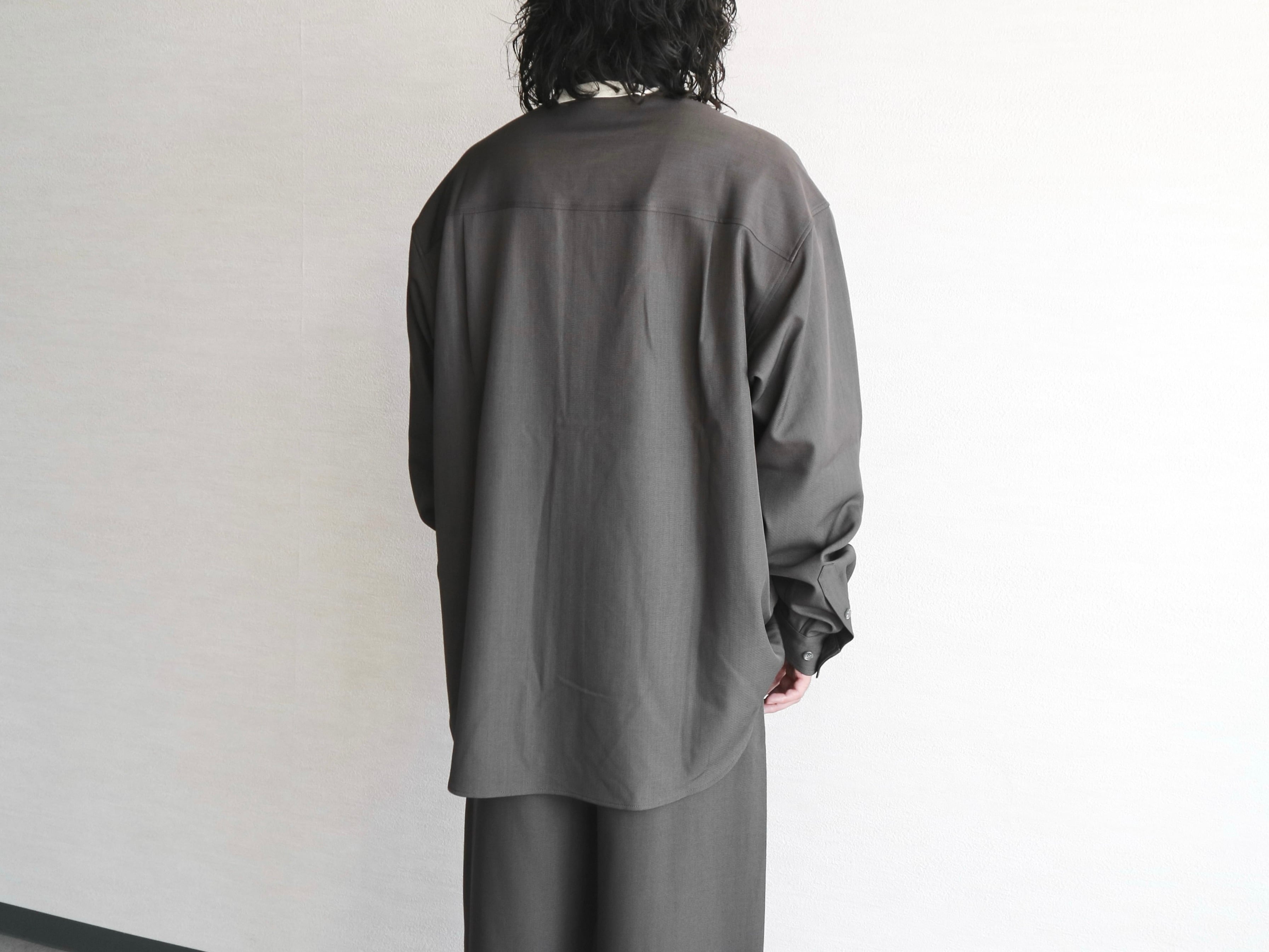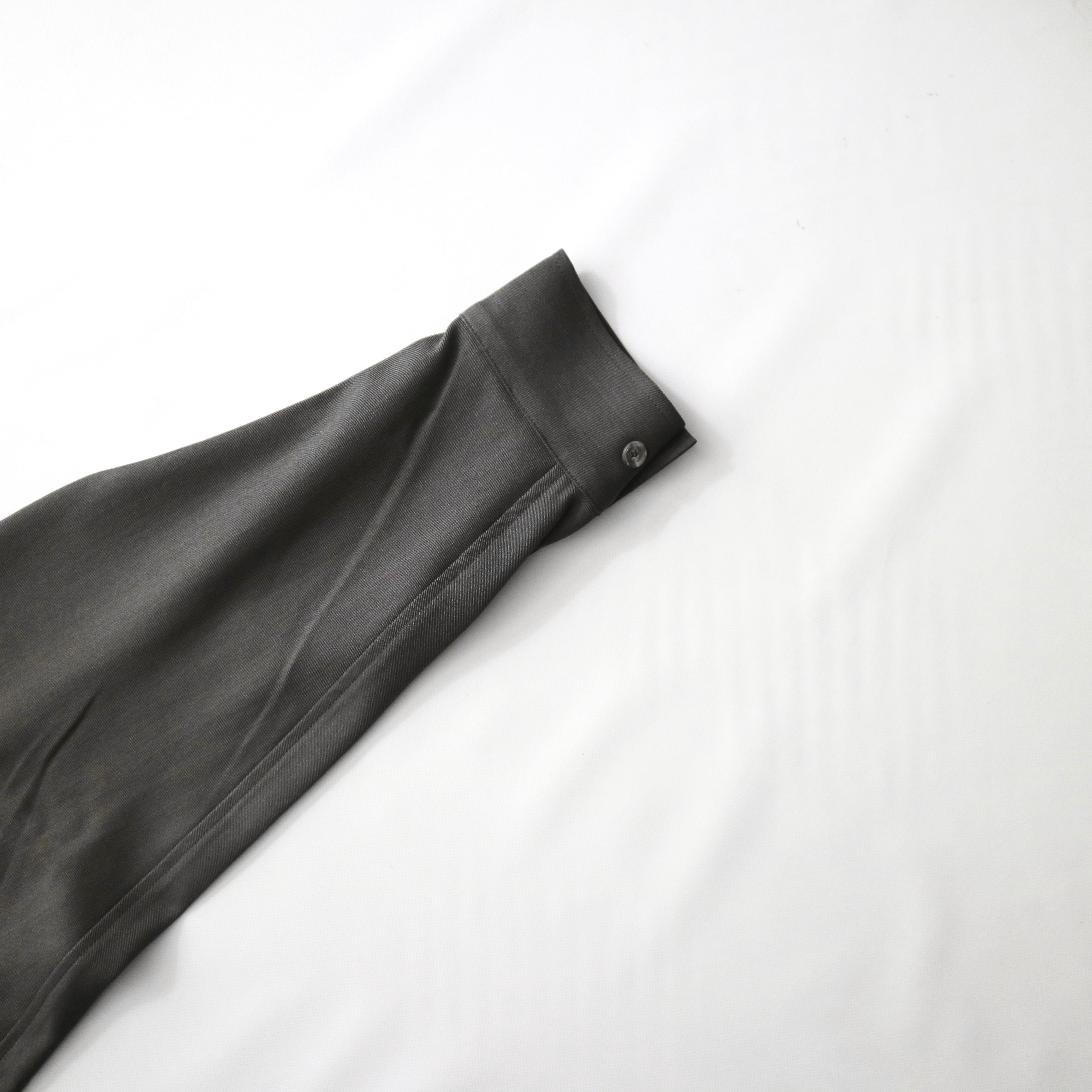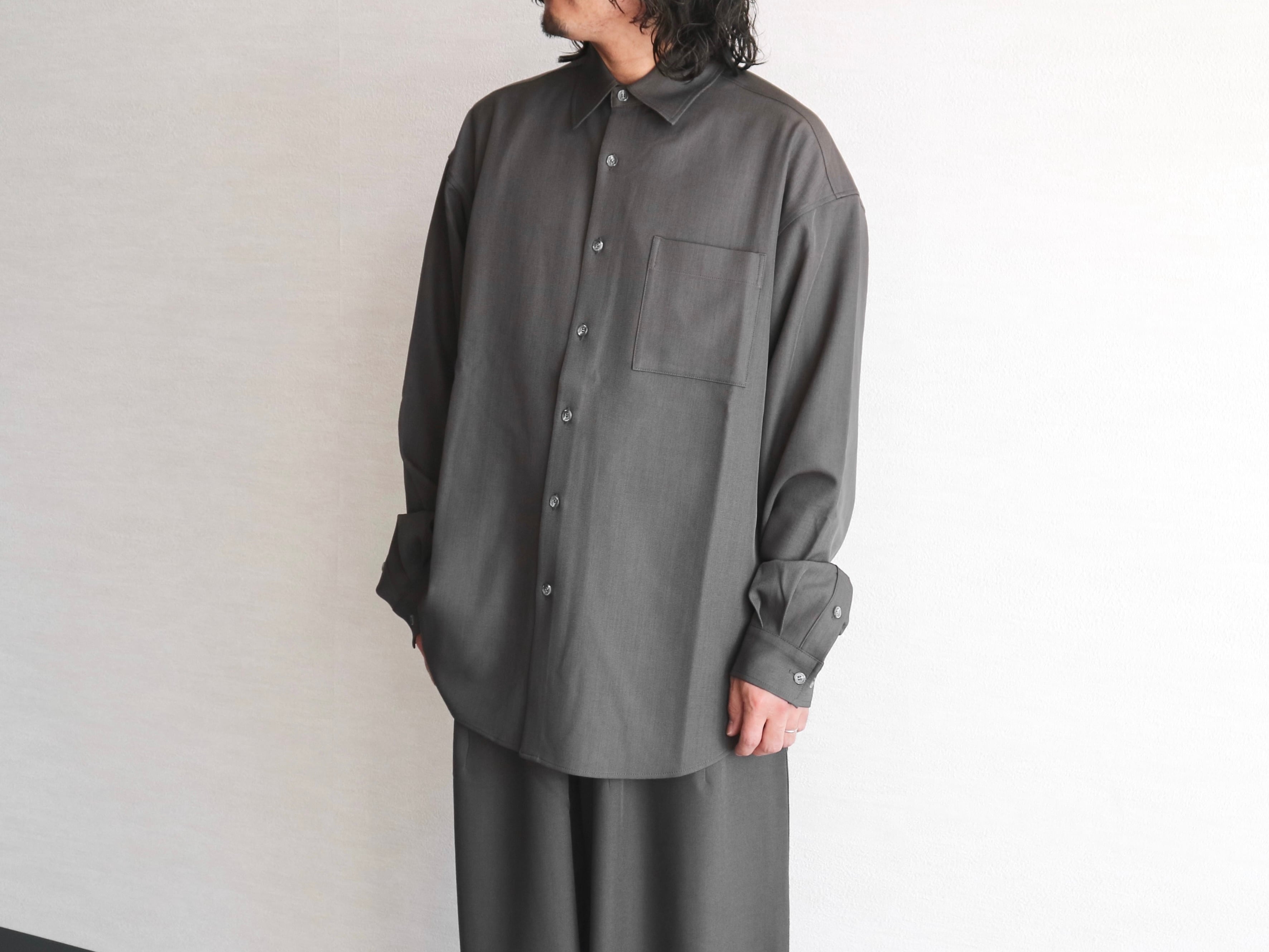 適度なウェイトとドレープ感のあるストレッチポリエステルツイル素材を使用したオーバーサイズシャツ。