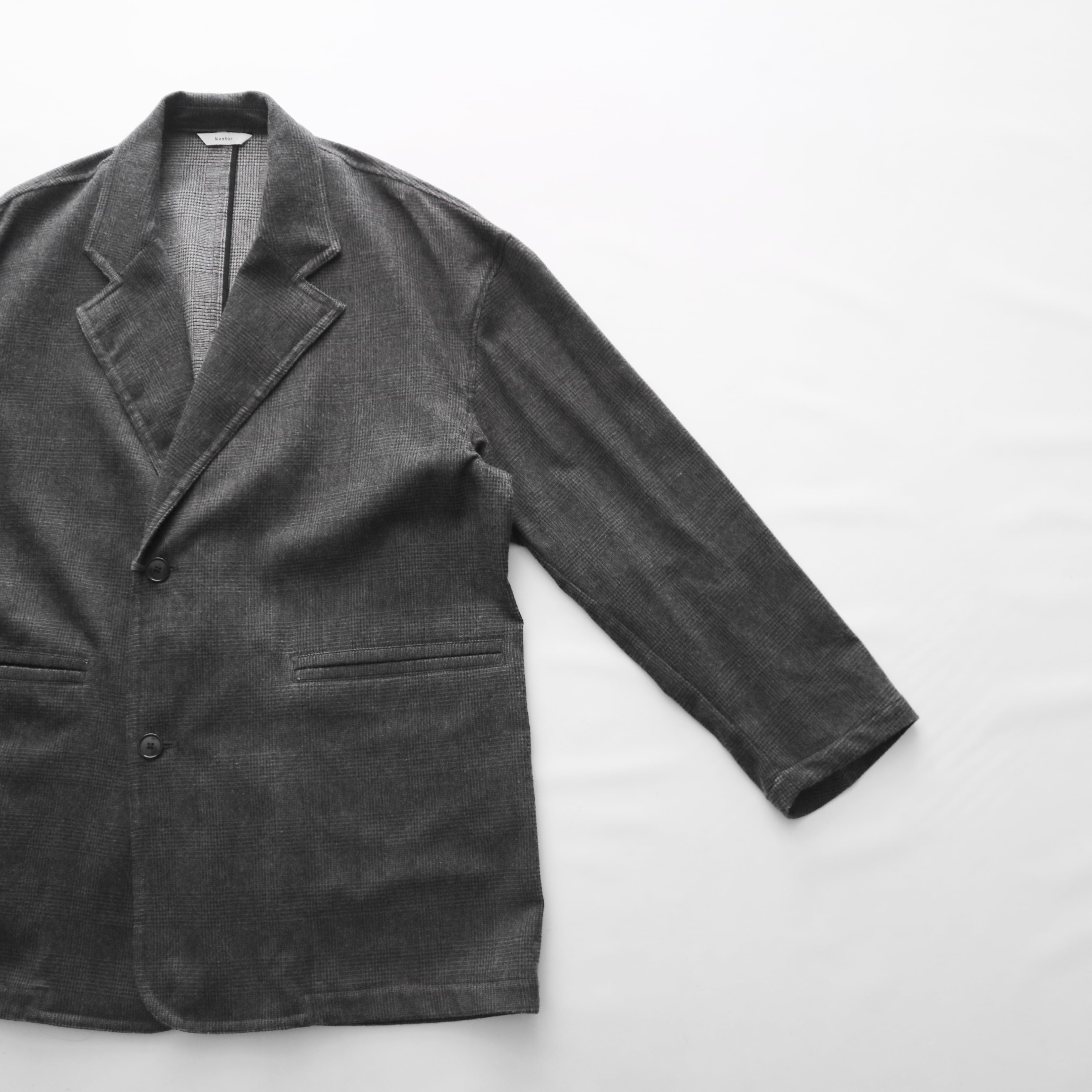 ウールの産地である尾州で生産されるストレッチ入りの先染めのウール生地に全面顔料コーティング加工を施し、柄がかすかに見える様、濃くコーティングしたオリジナル生地を使用しています。