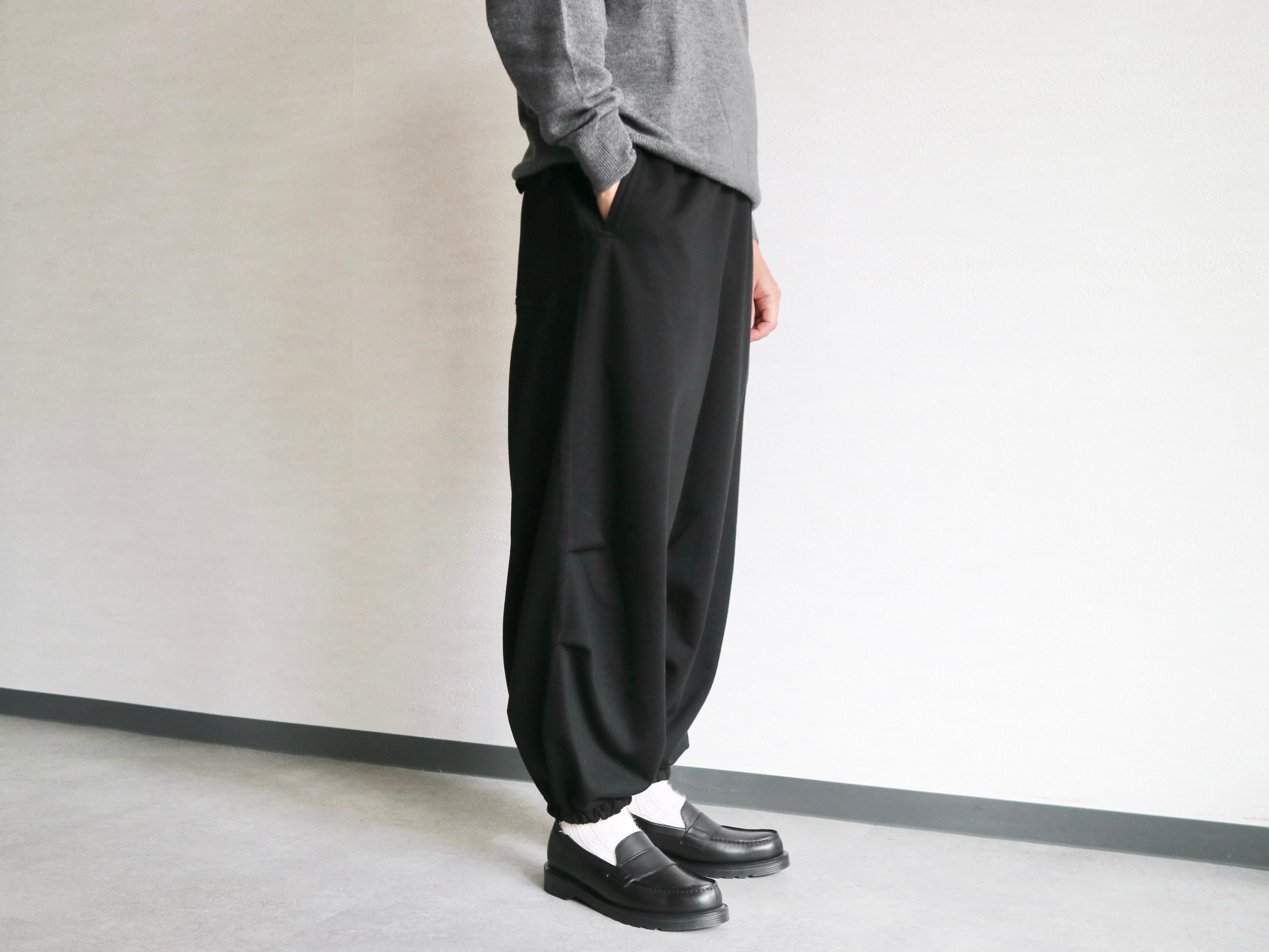 ウエストと裾はゴム入り仕様でスポーティーな作りで、膝には深いプリーツを取ったワイドシルエットが特徴的なトラックパンツ。