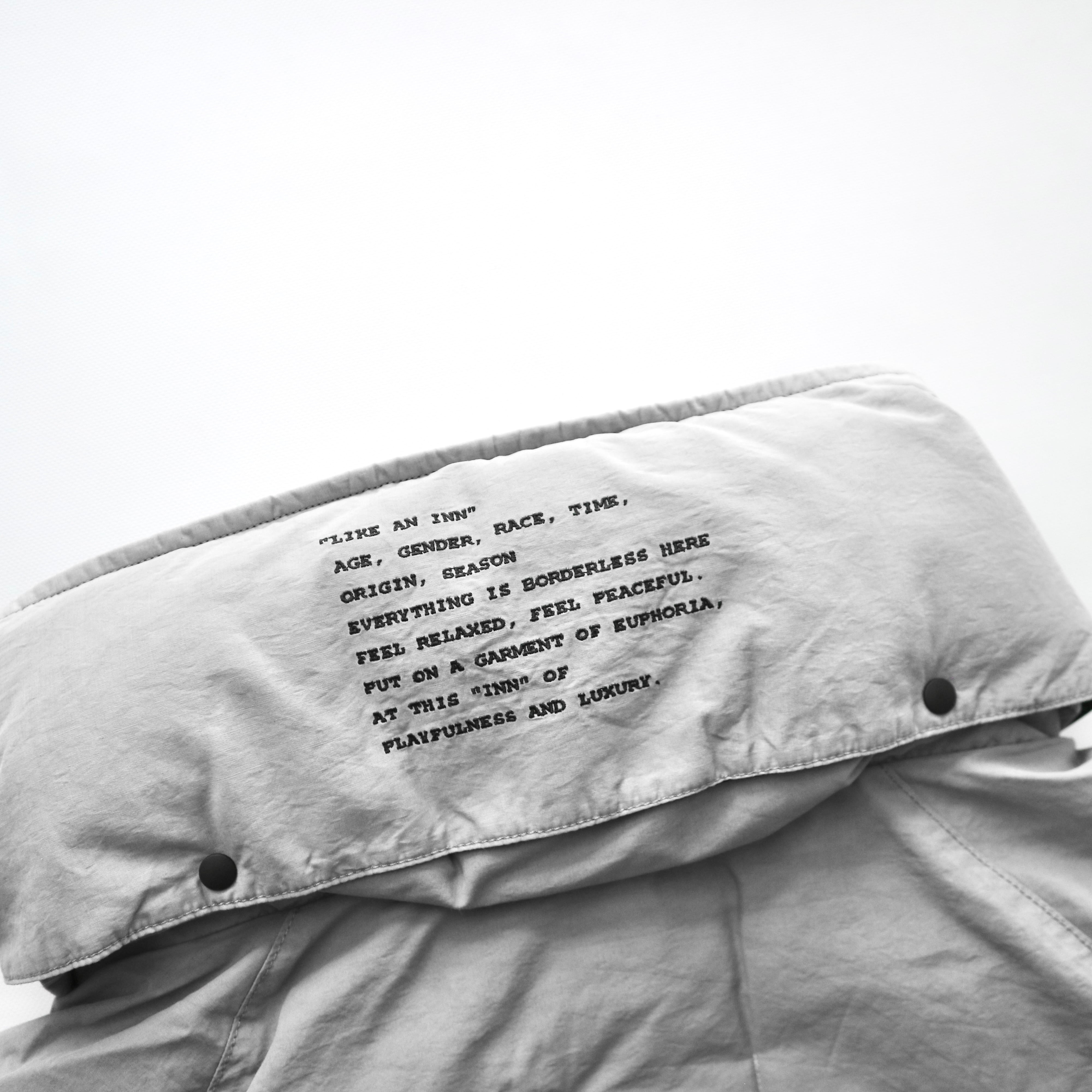 ⼤きめのフードは衿部分に収納可能な2WAY仕様に変更、収納時の後ろ衿にはINNATのブランドコンセプトが刺繍されています。