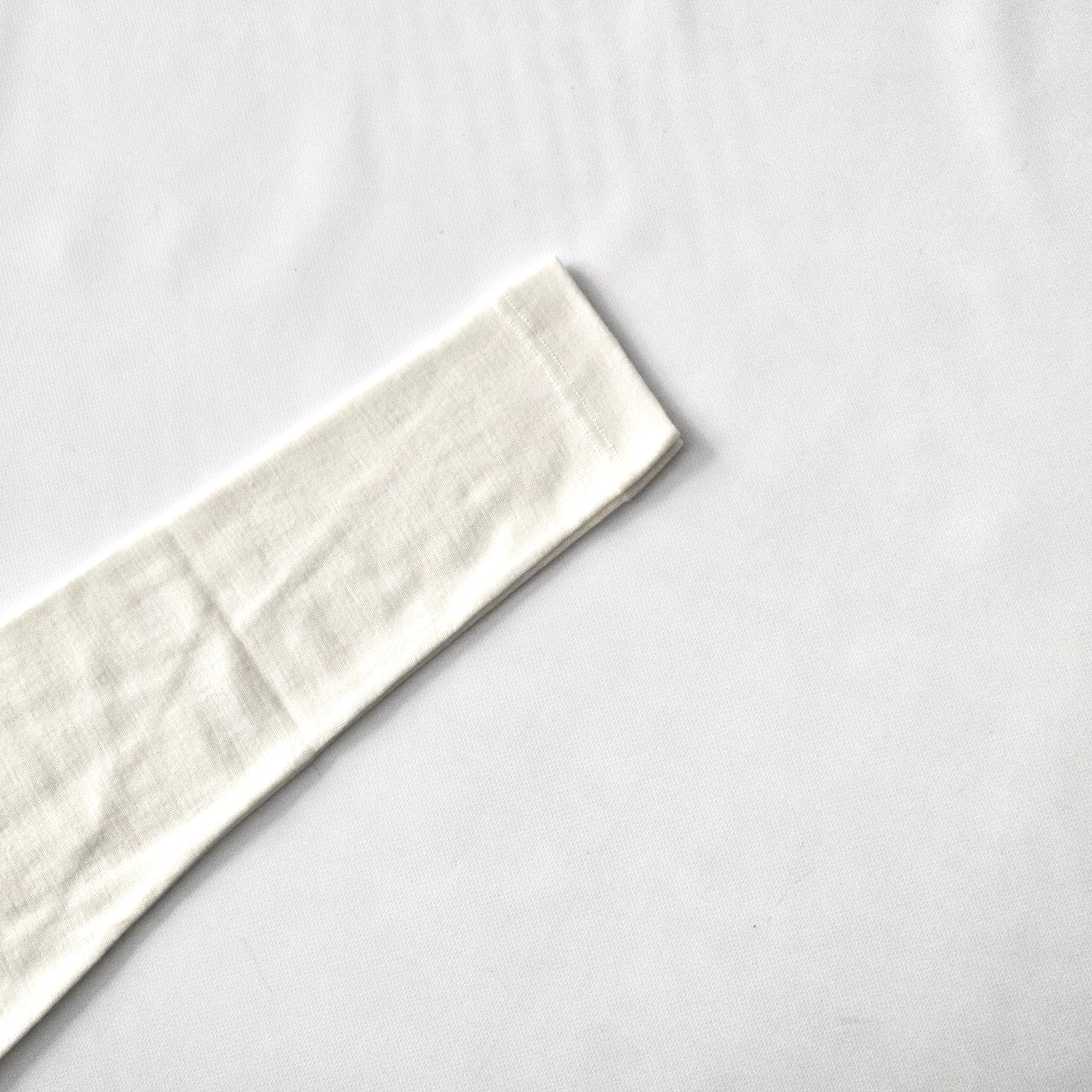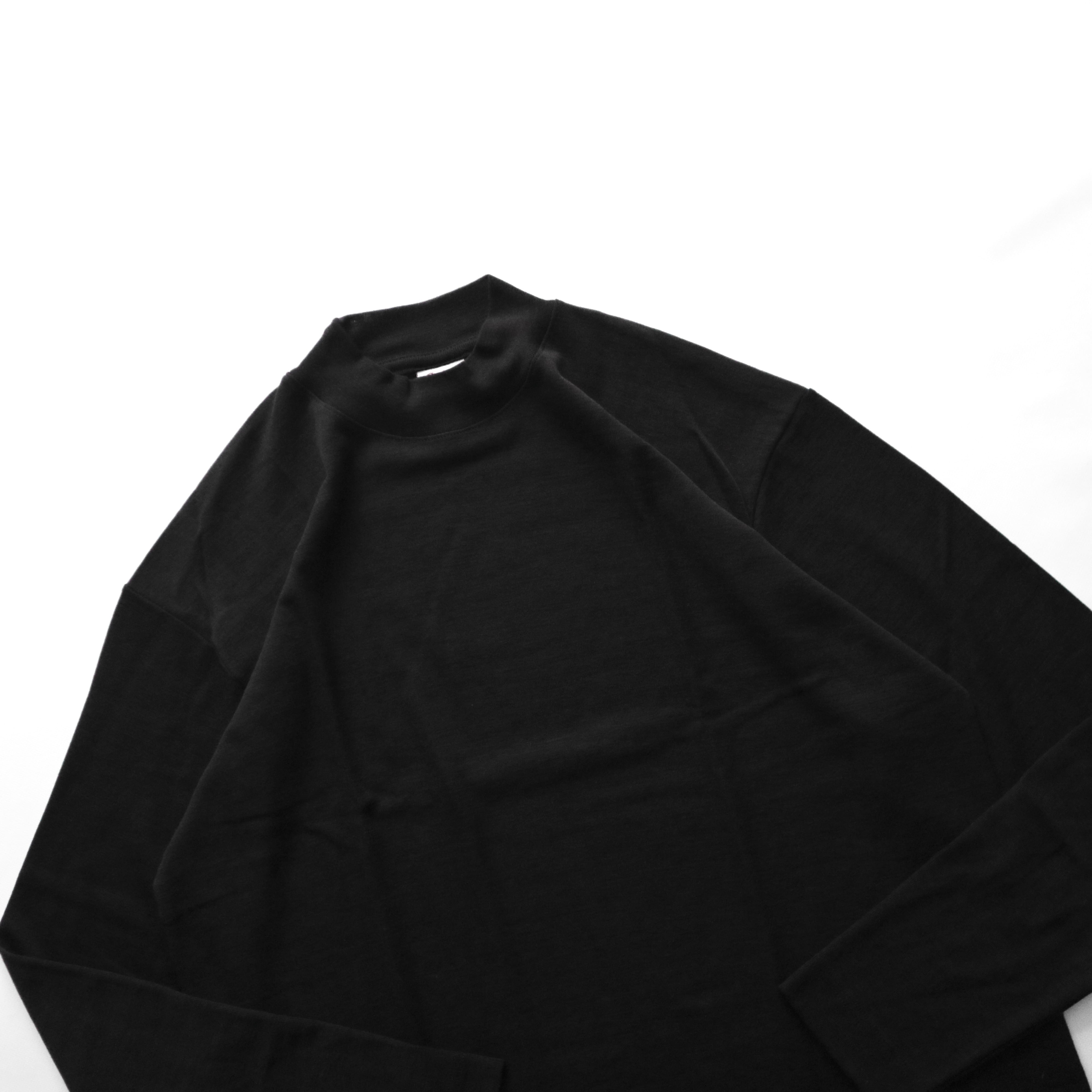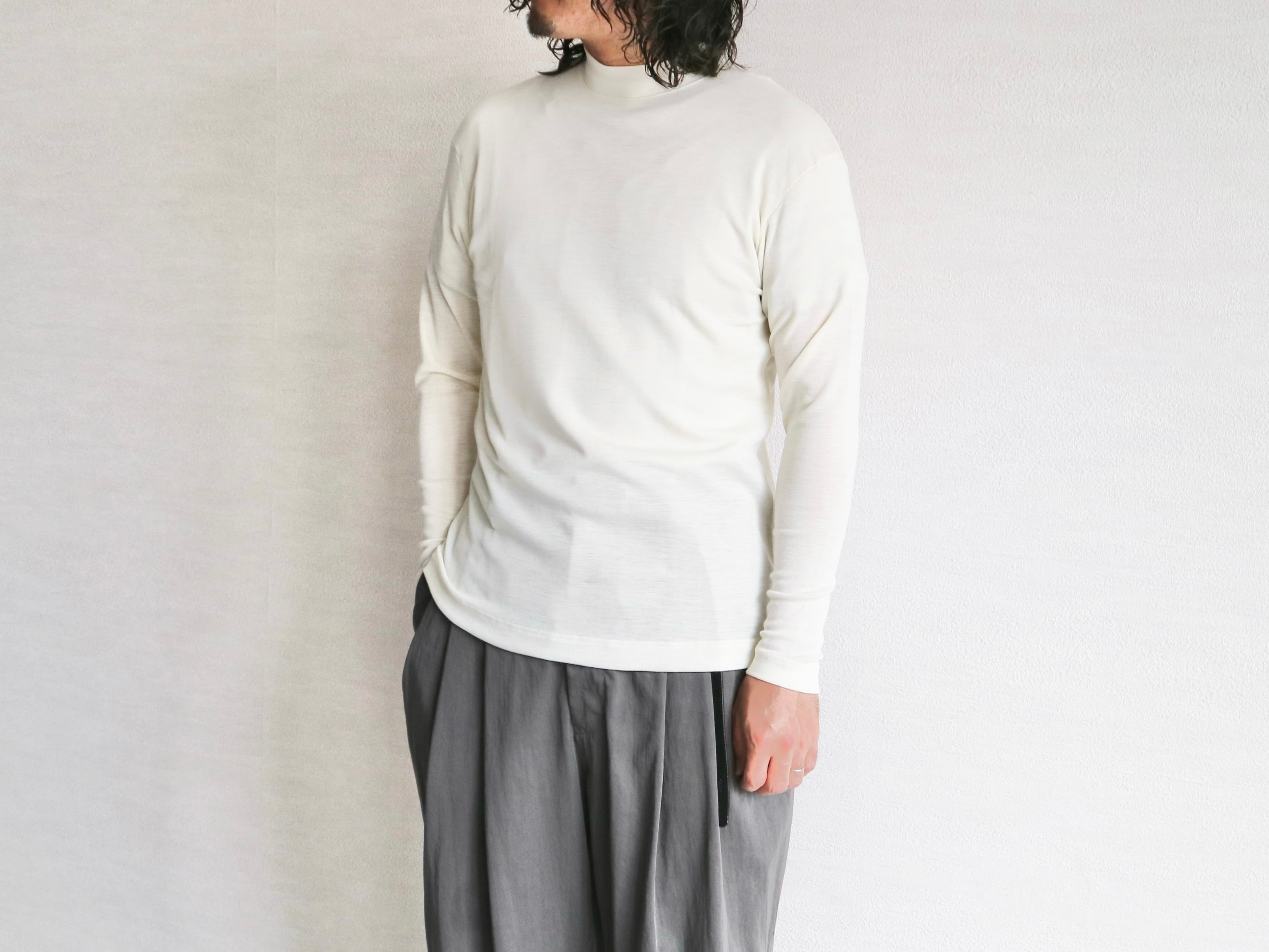 コンパクトで幅広リブのネックデザインが、クルーネックではあるものの着用時にモックネックにも見えるところが特徴です。