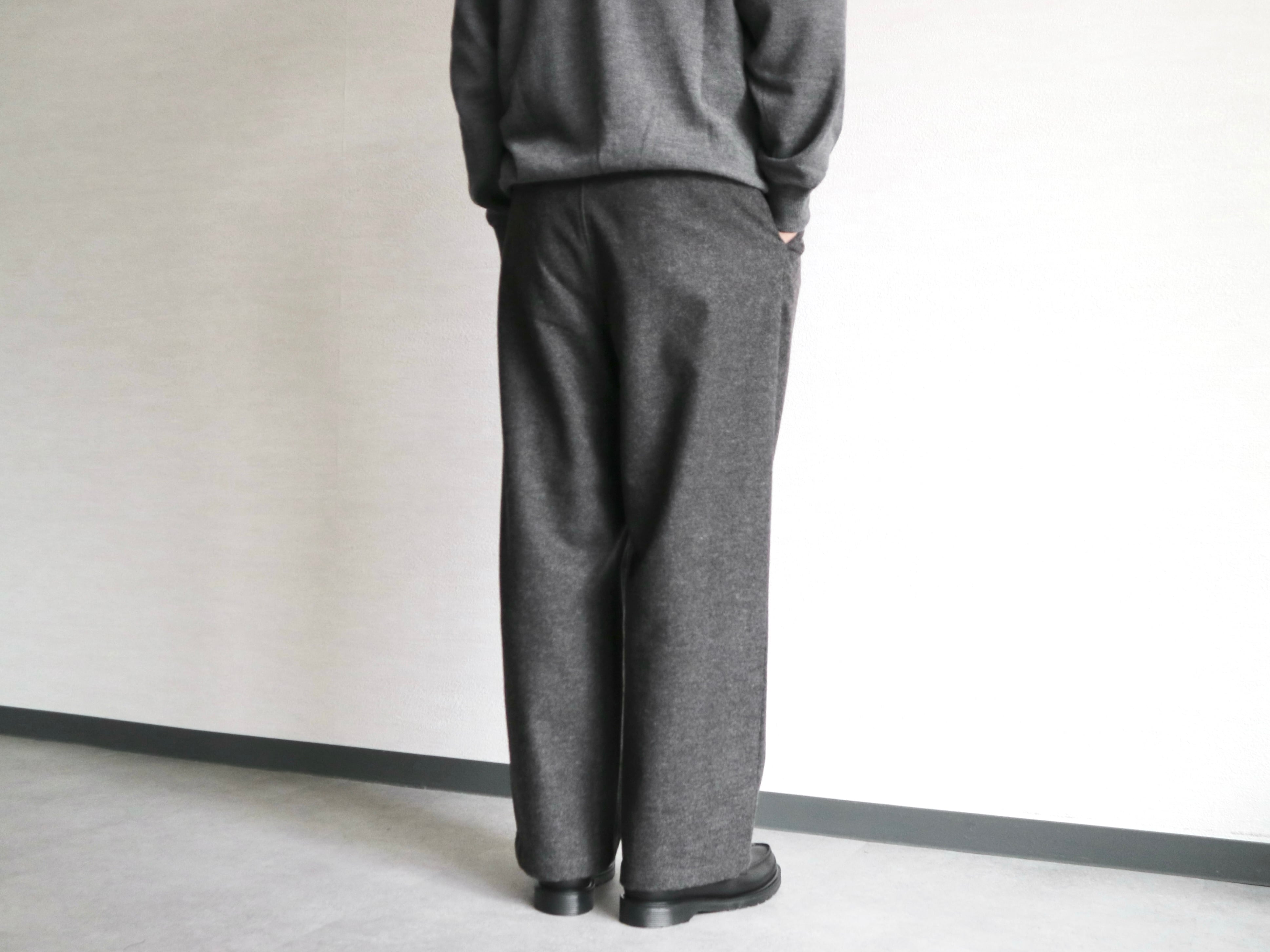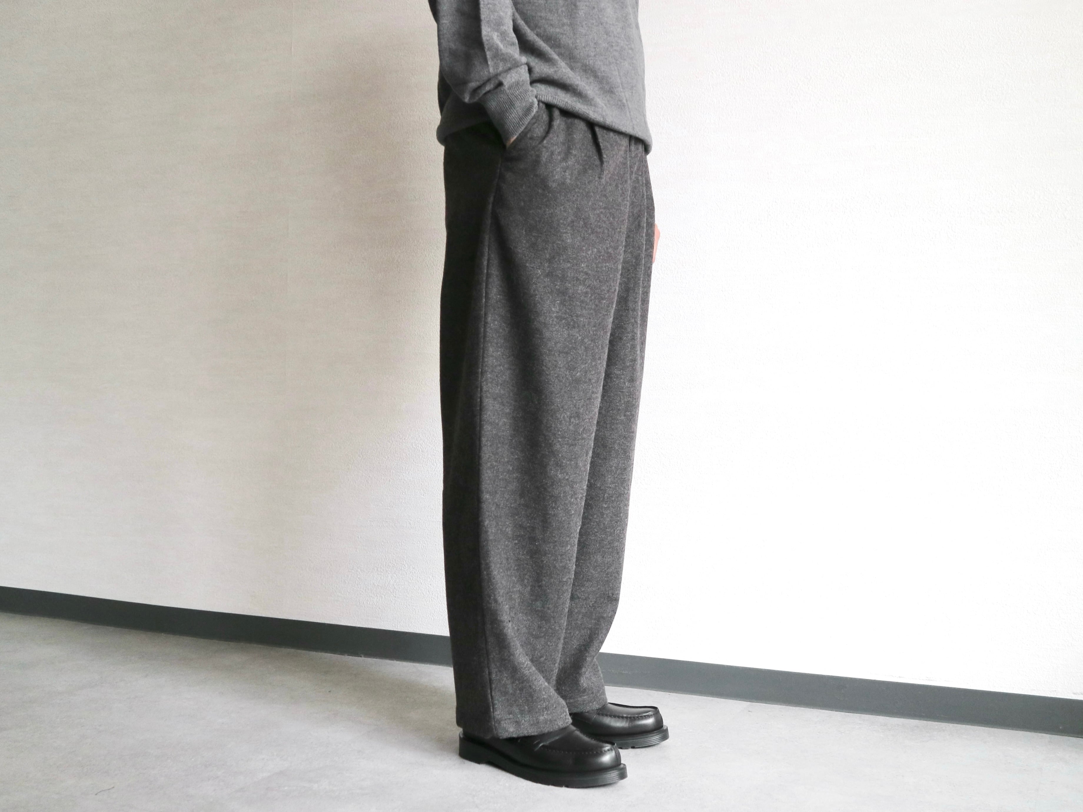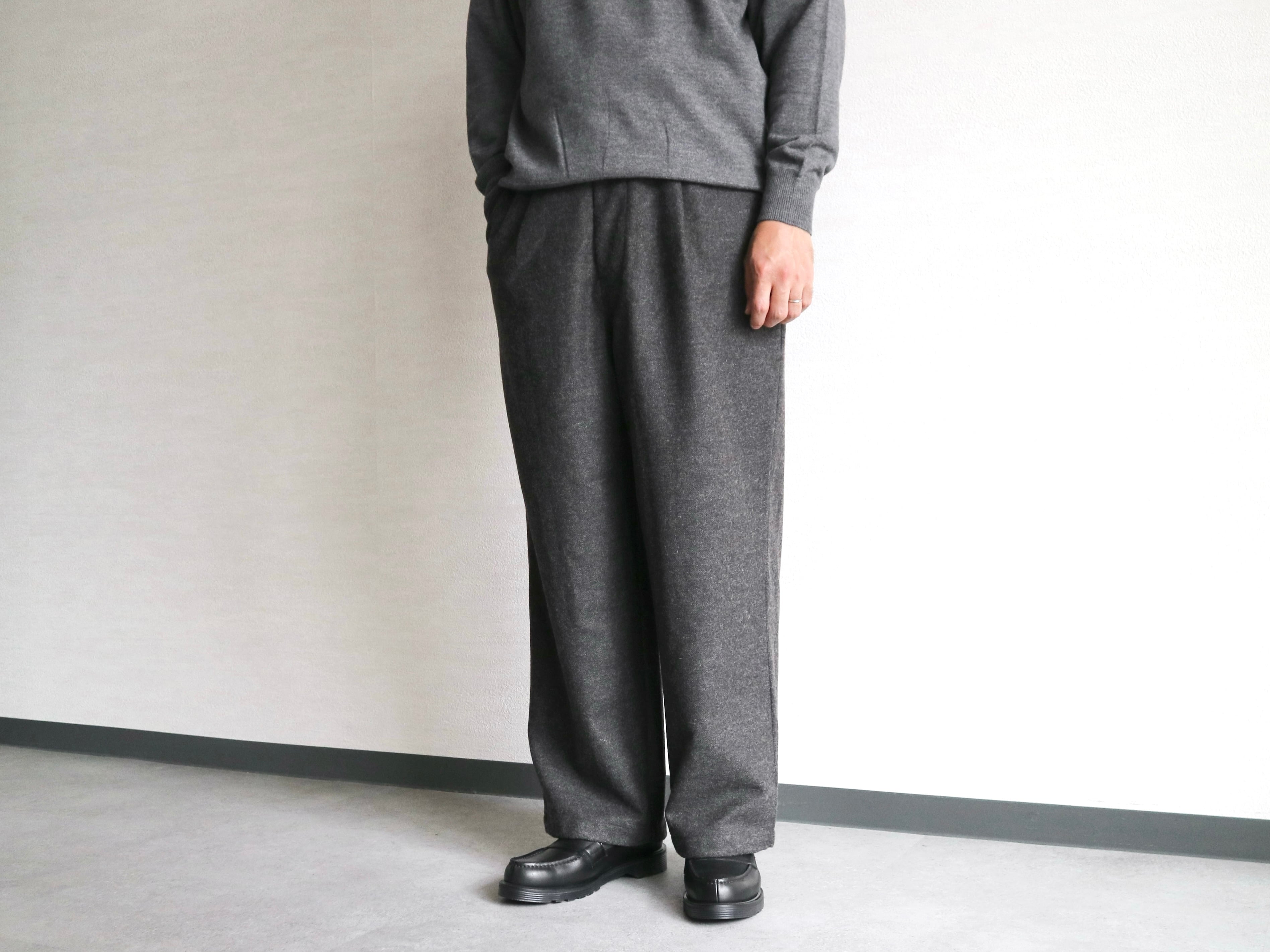 尾州の機屋が別注で作った糸を使用し、オリジナルのツイードライクな生地を使用したタックワイドパンツ。