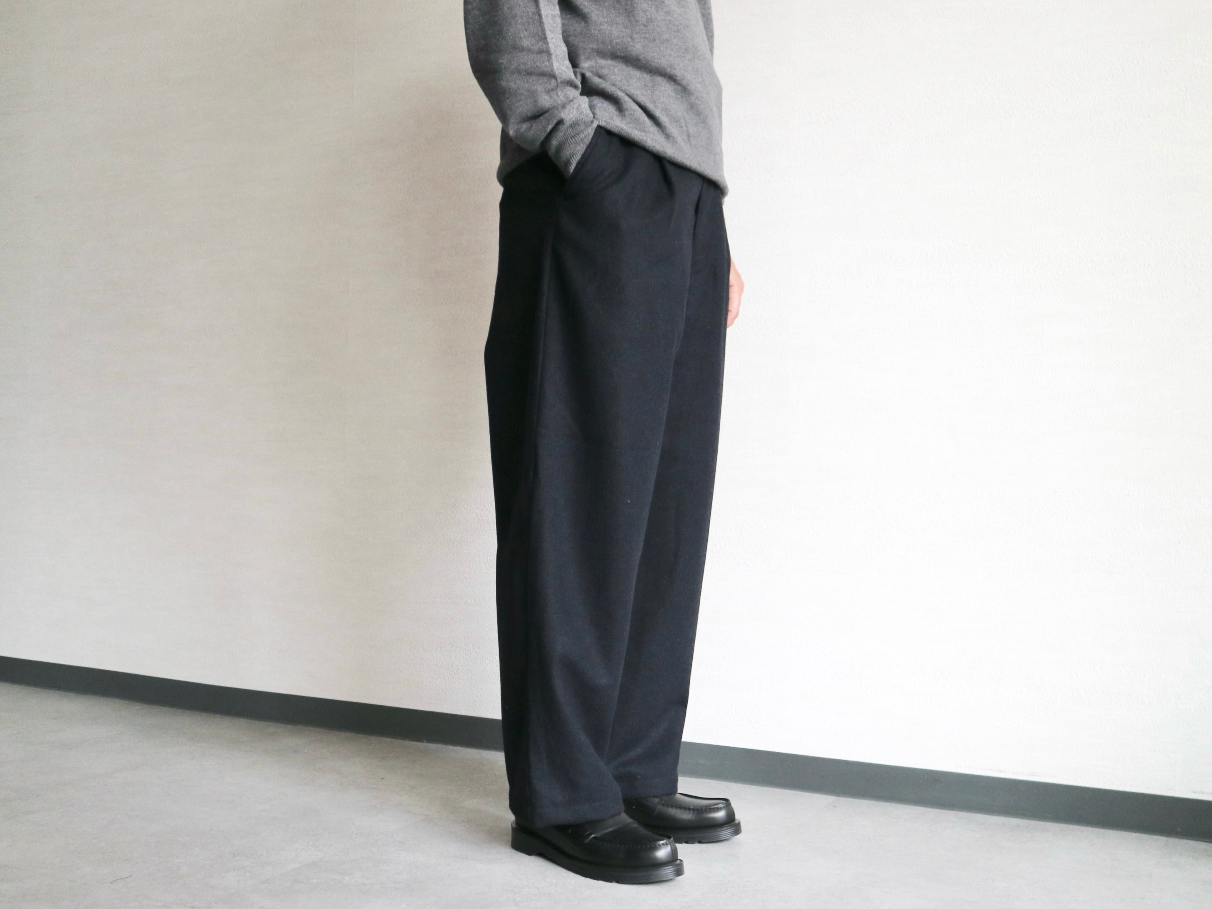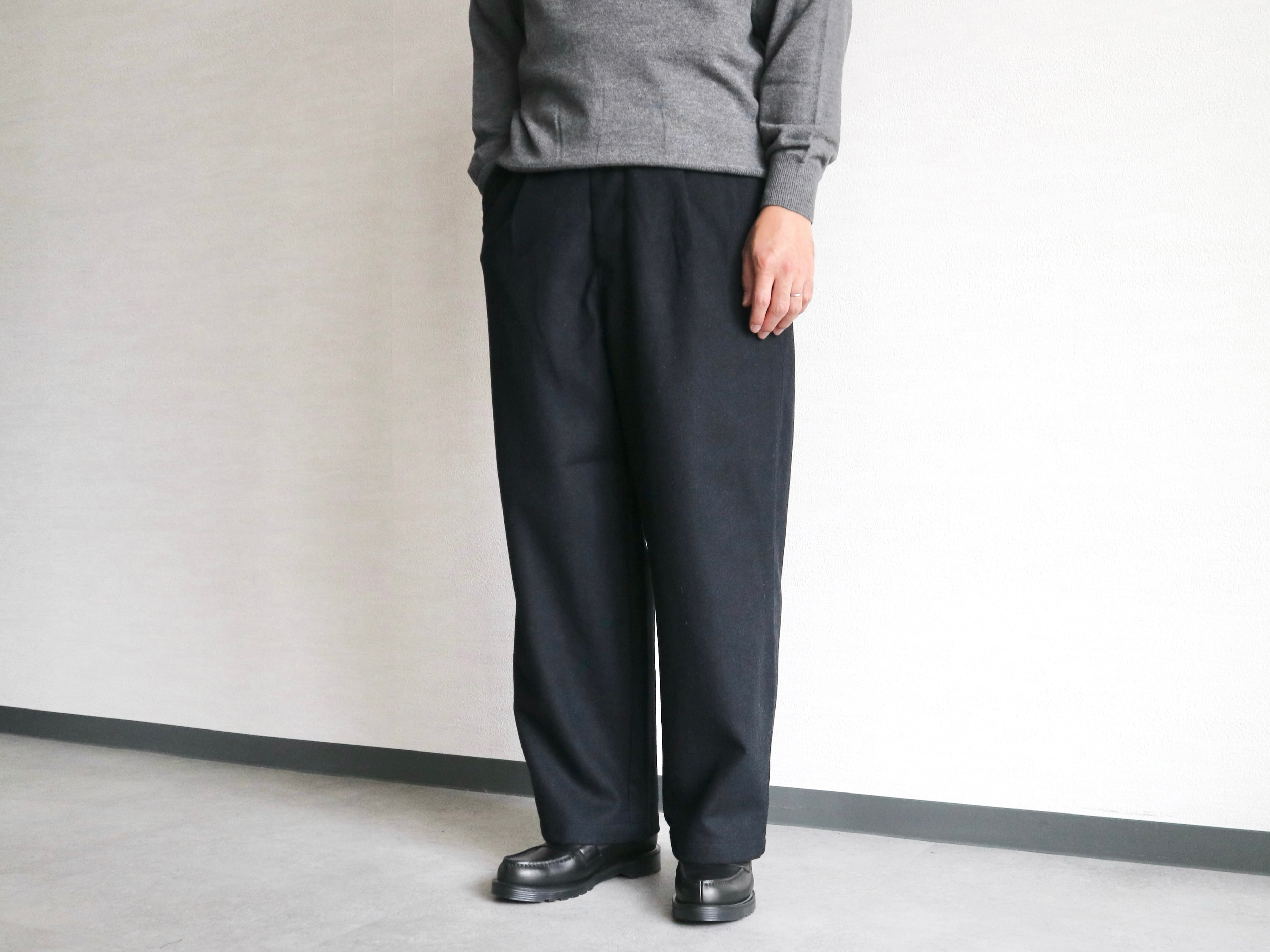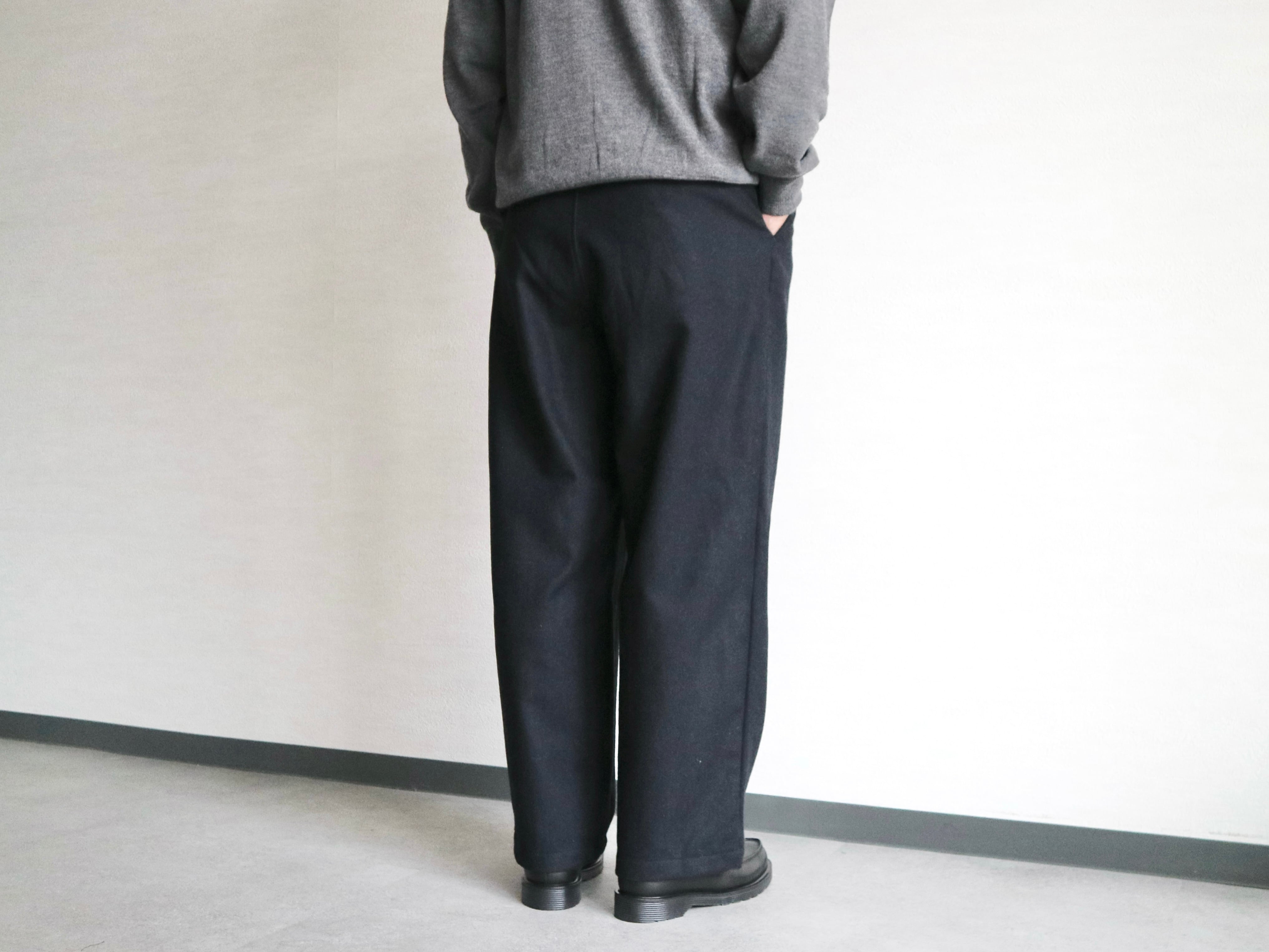 タックの入ったワイドシルエットで、テーパードを緩やかにすることでストンとしたラインとなります。
