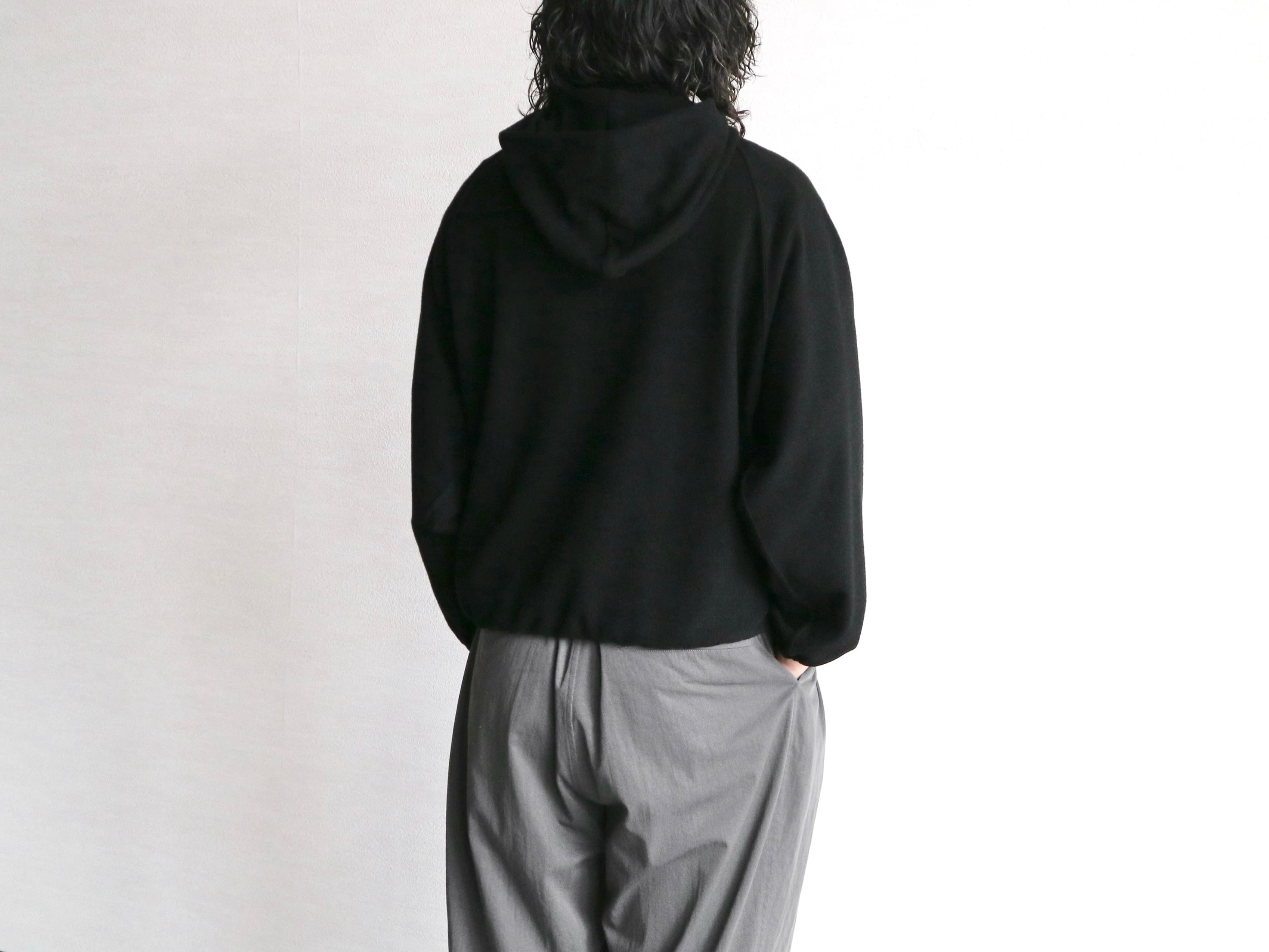 フードの中心をリブで切り替えたラグランフーデットパーカー。
