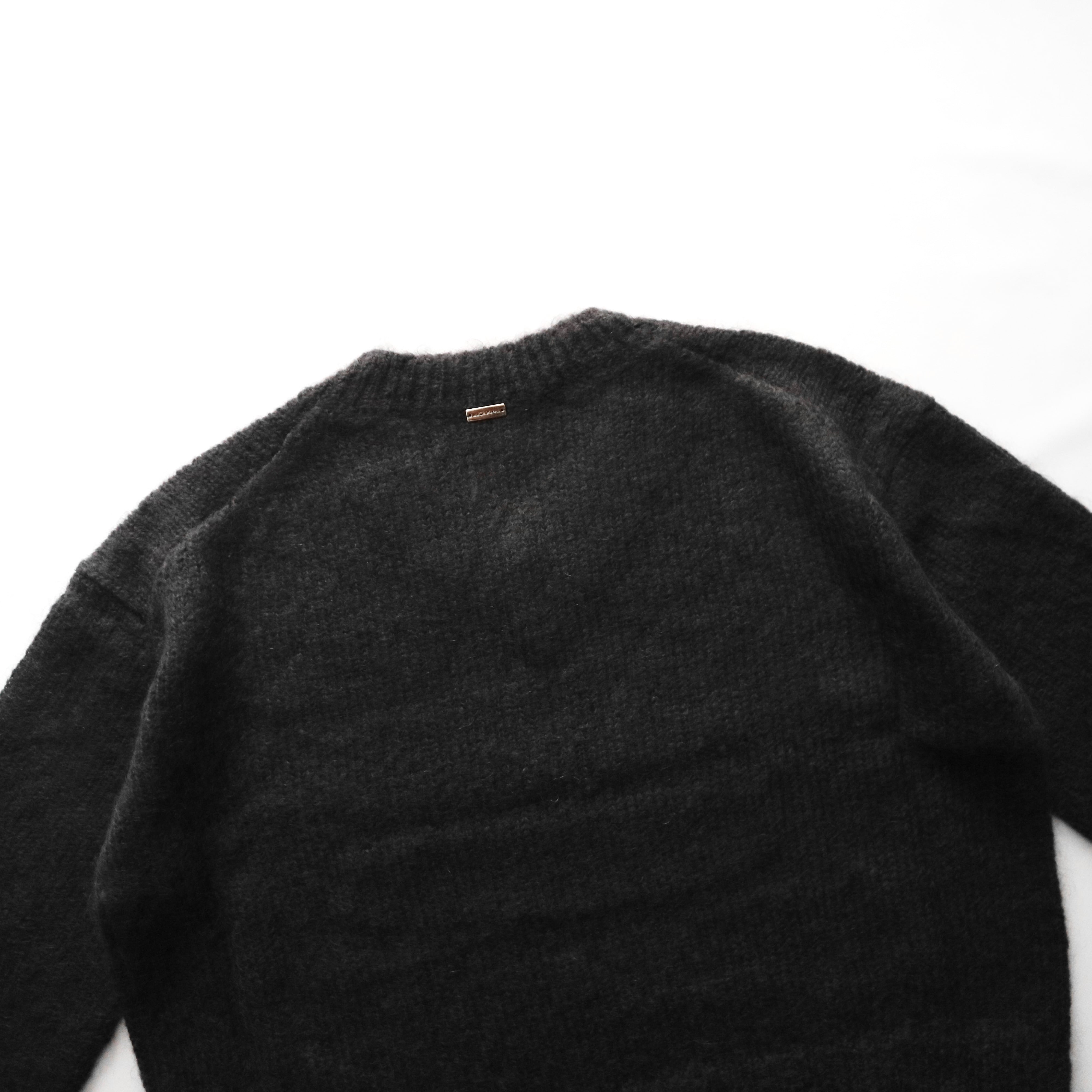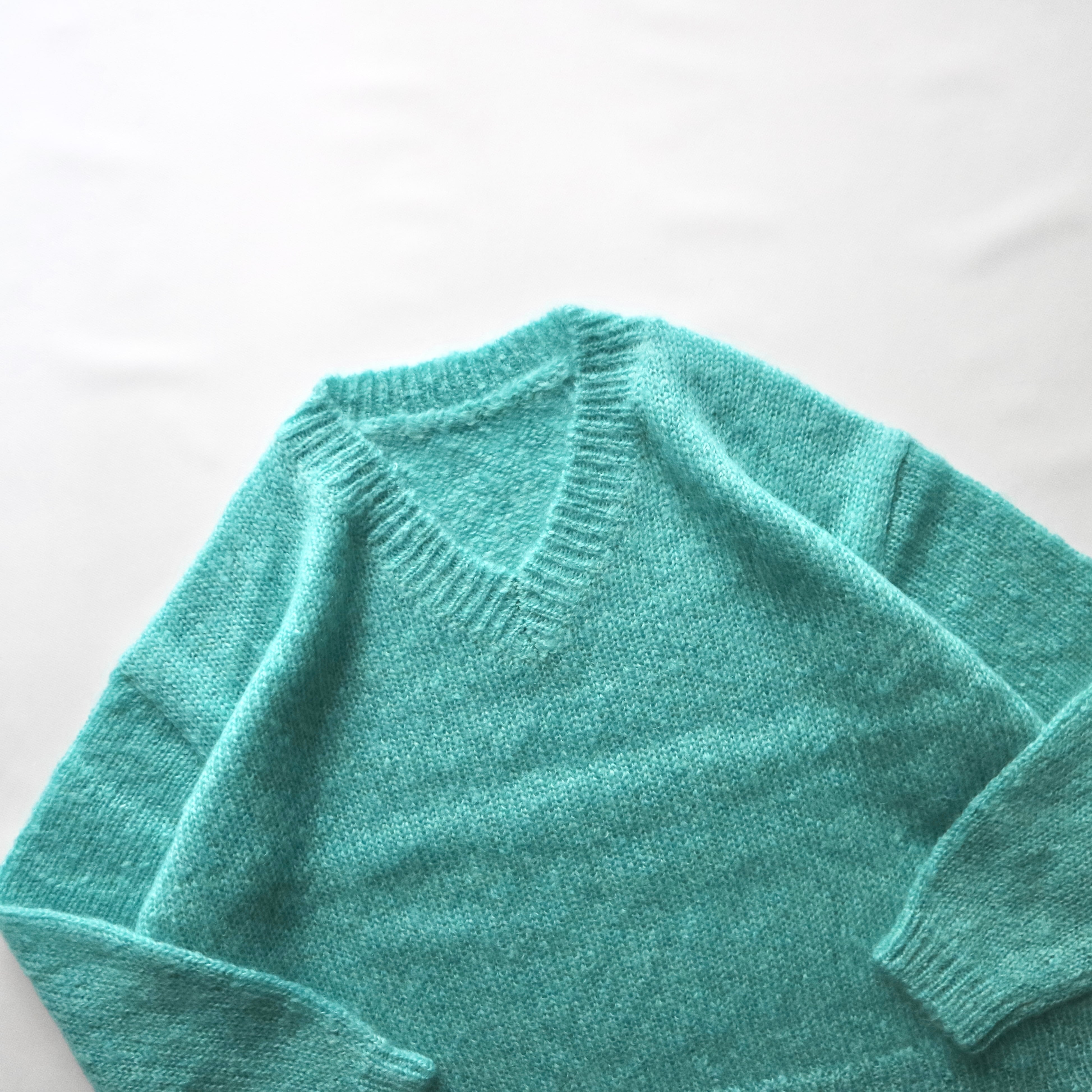 手編みの糸を編み機で編めるようにし、一般的な紡績されたモヘア糸よりも毛足が長くなり上品な風合いで、肌に刺さらずストレスフリーに着用できます。