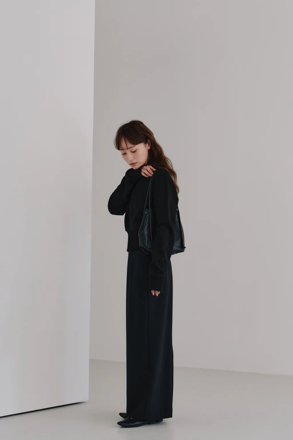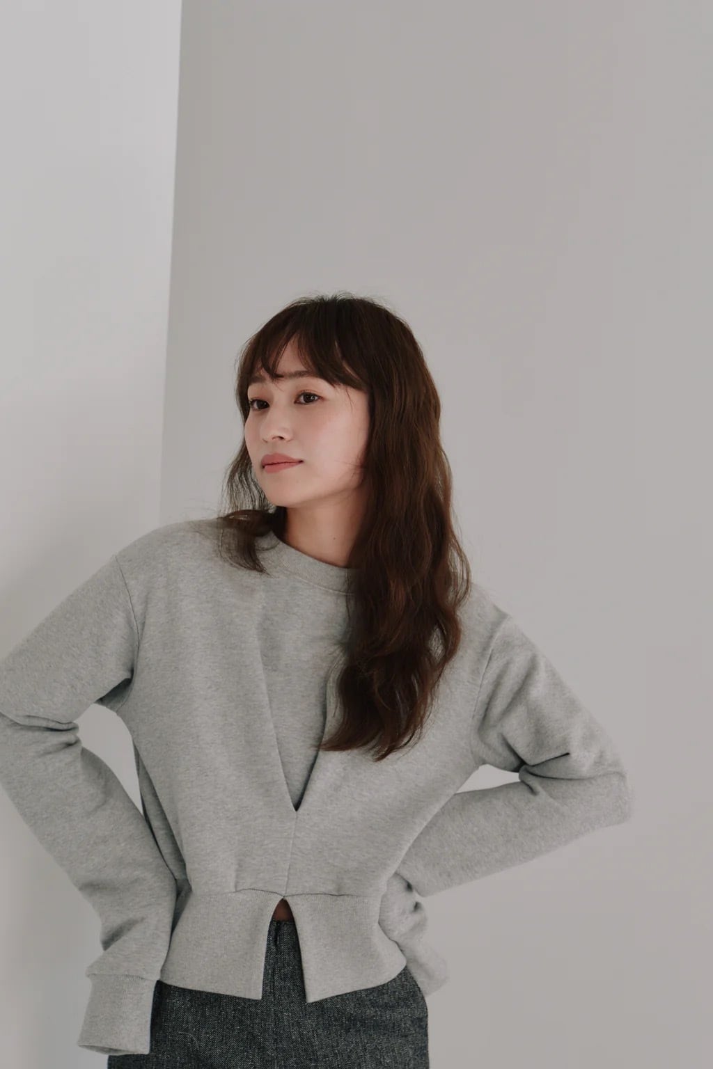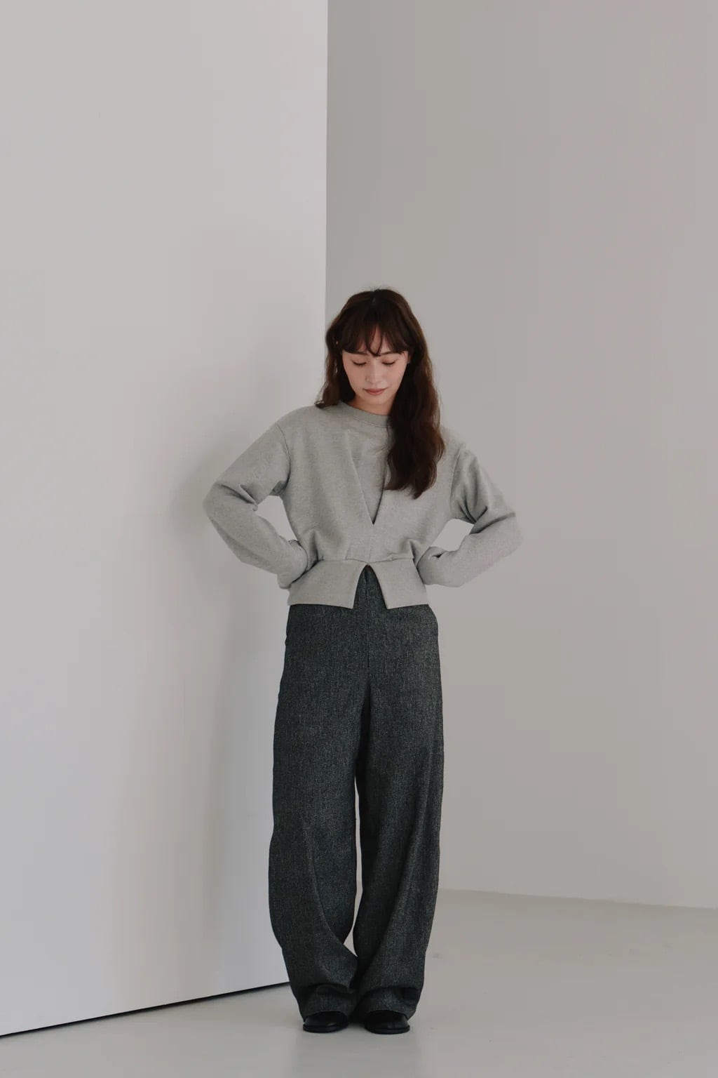 シンプルなスウェットに立体感をプラスし、洗練された表情を演出しています。