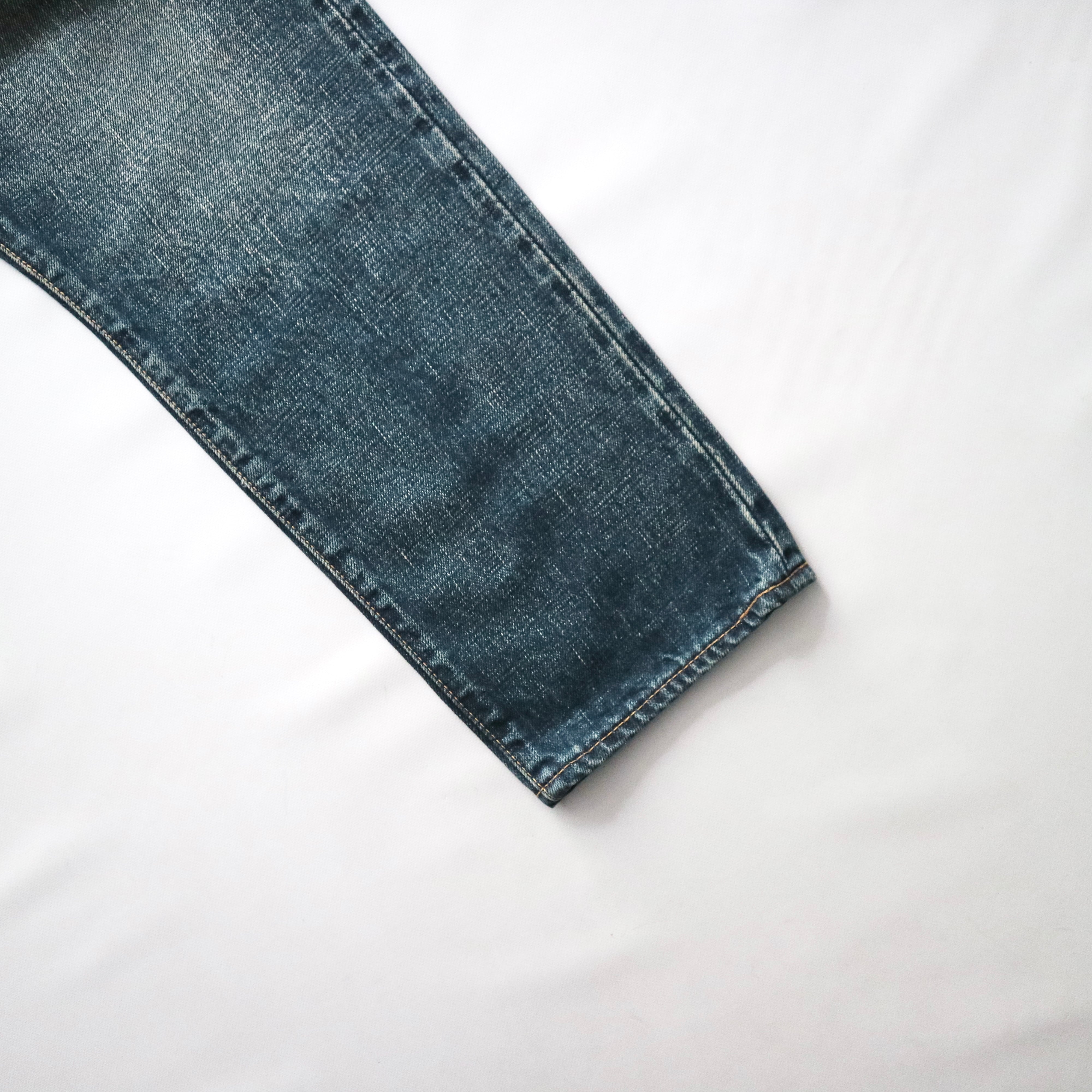 15.5オンスのデニム生地にユーズド加工を施すことで、色落ちやヒゲなどをリアルに表現しています。