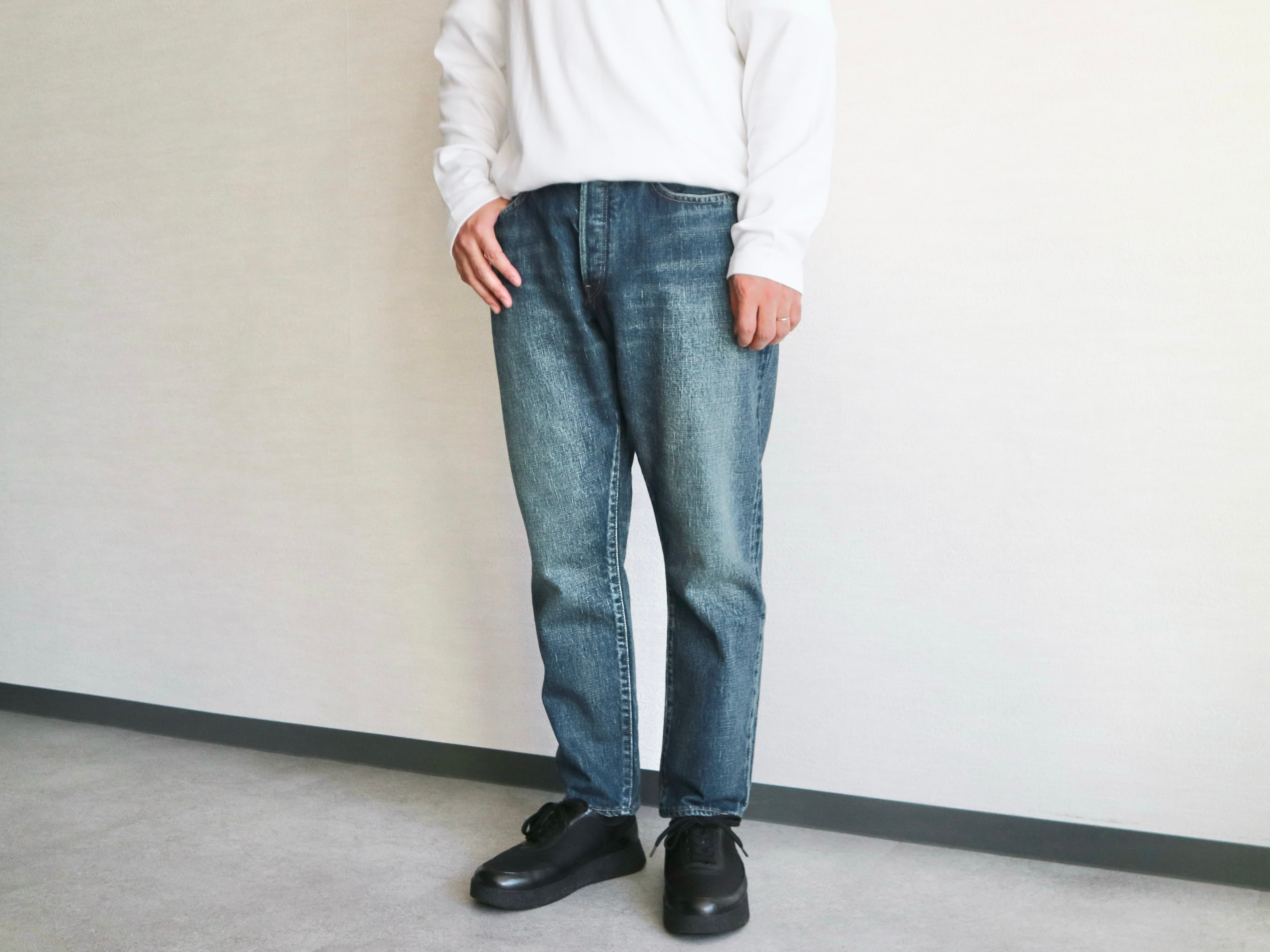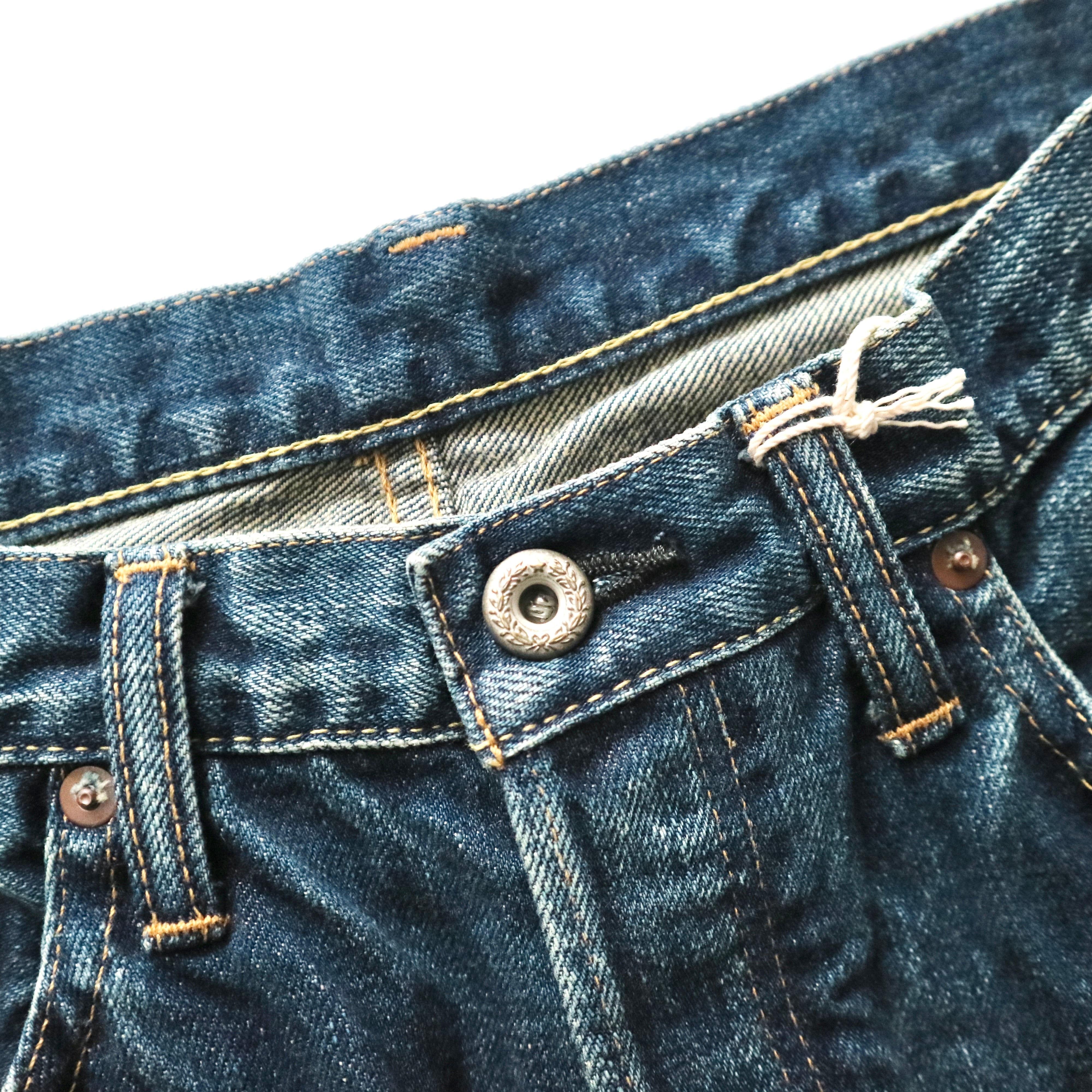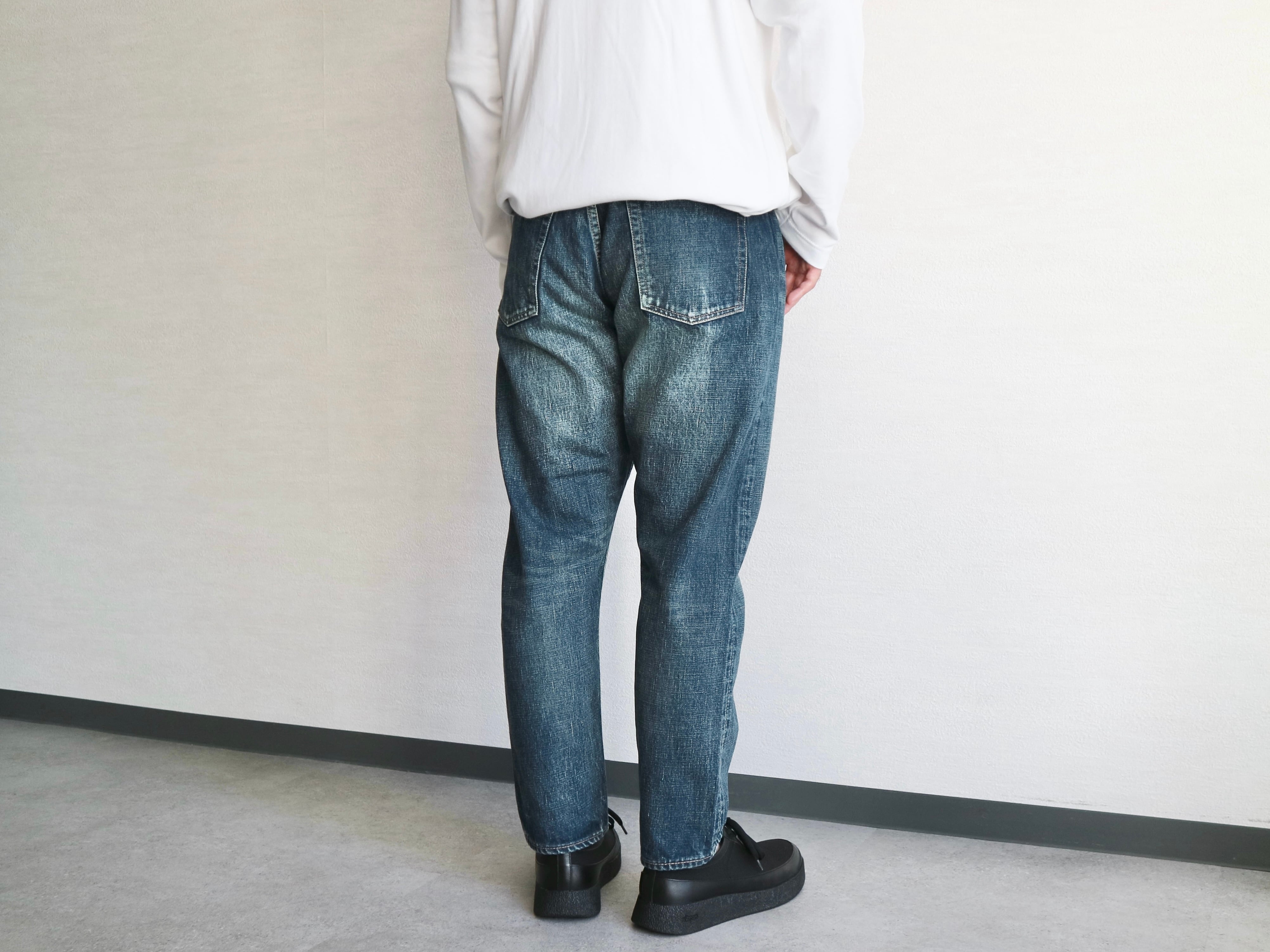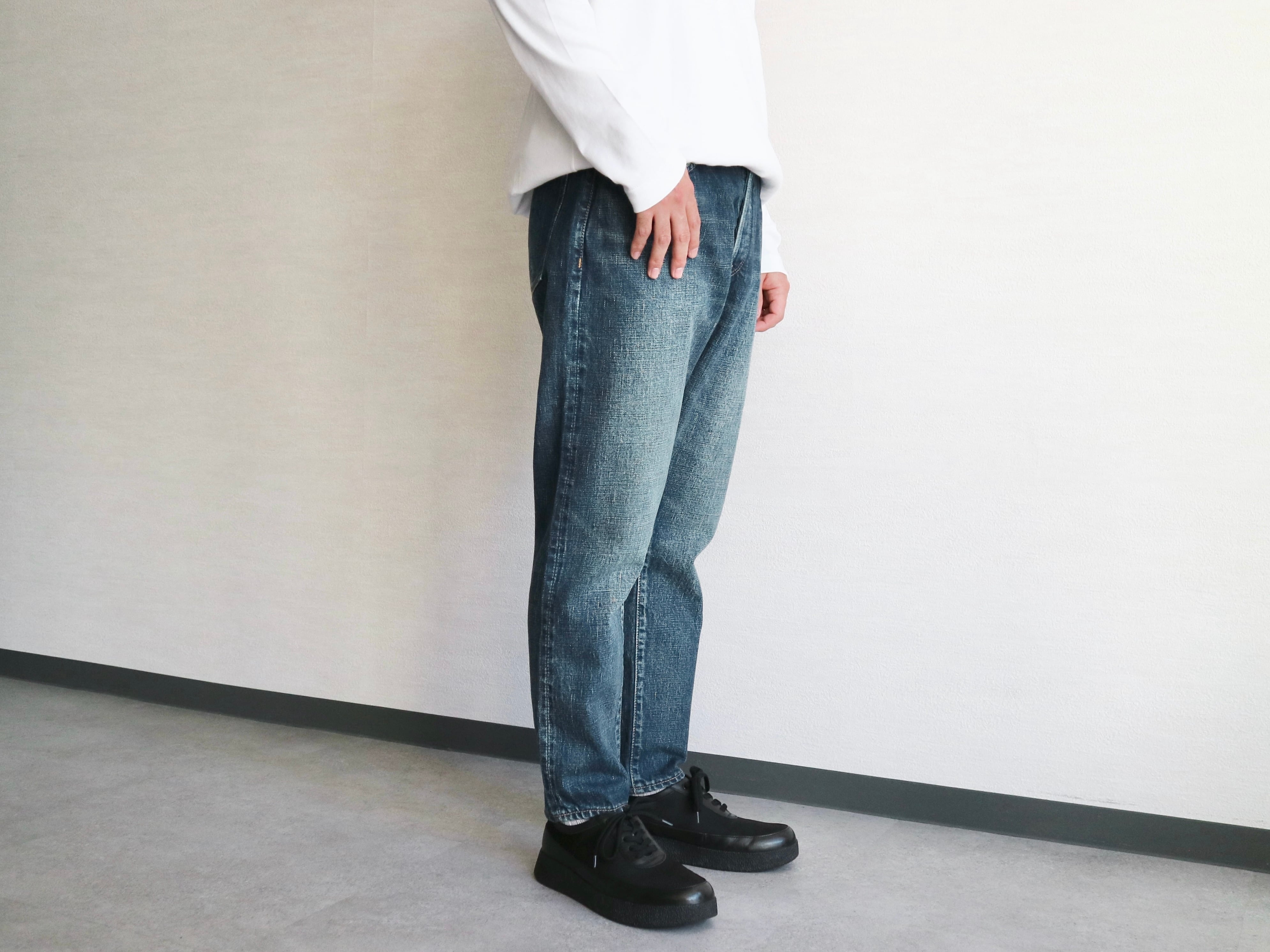 旧式のシャトル織機で織られたセルヴィッチ付きデニム生地を使用したテーパードデニムパンツ。
