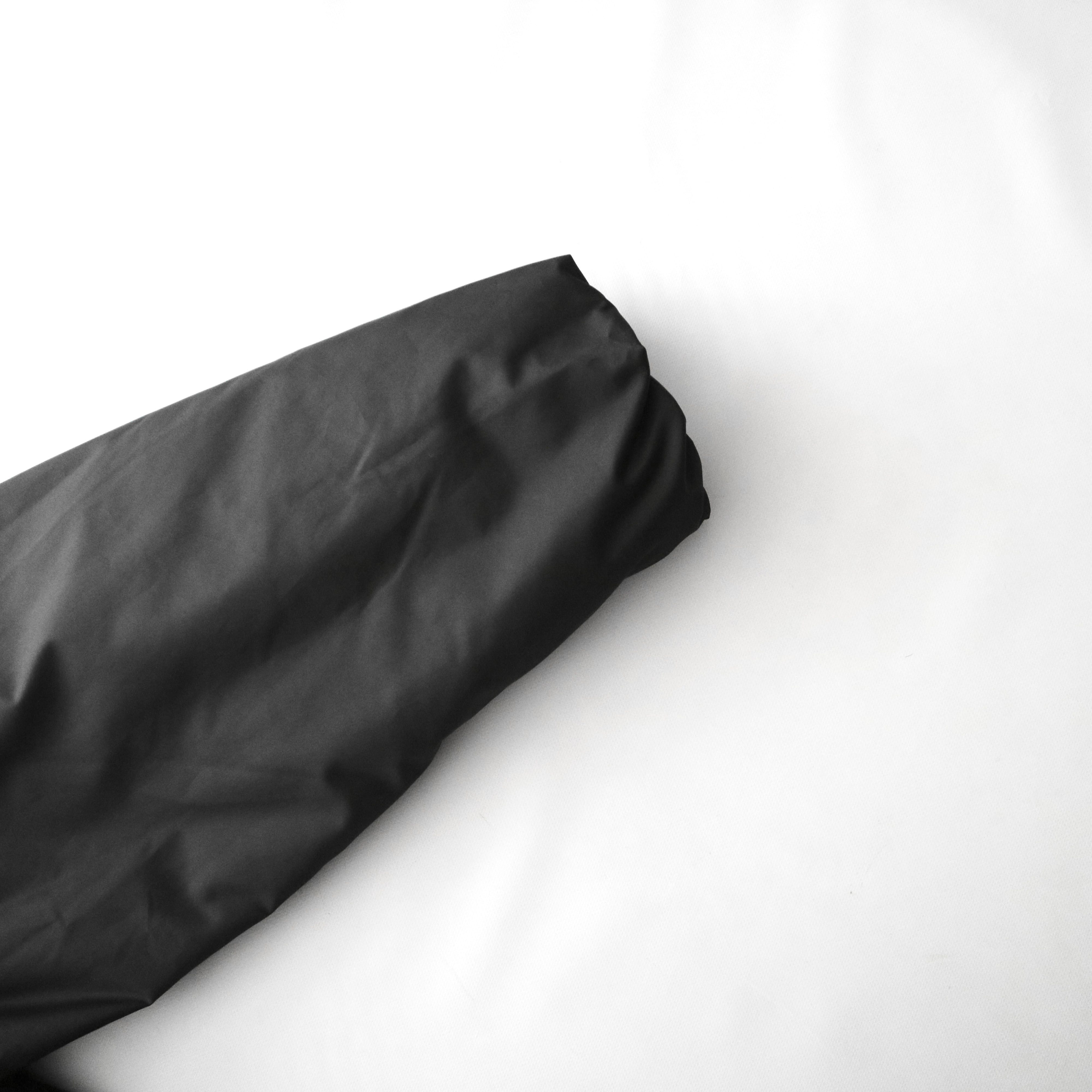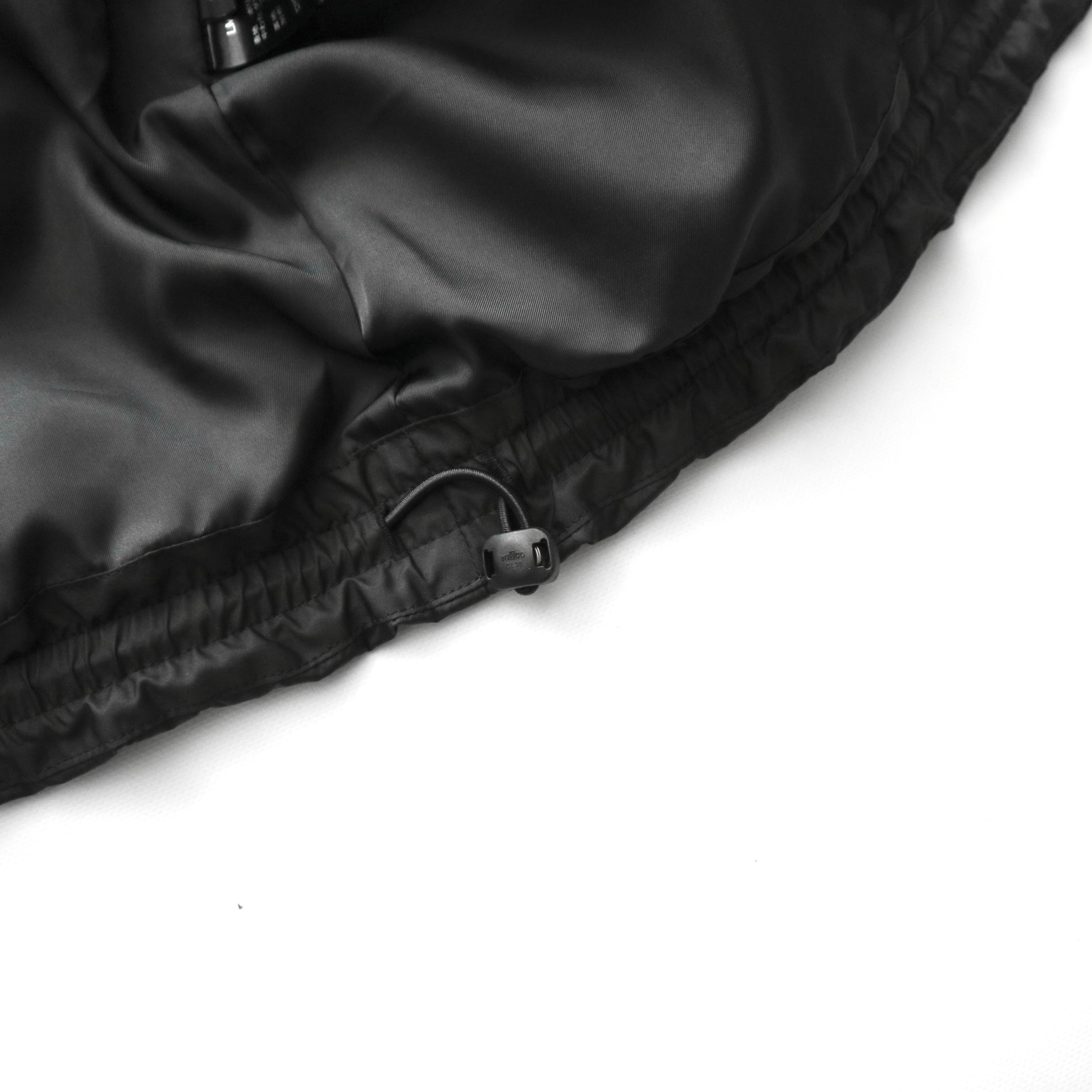シンプルでミニマルなデザインではあるものの、フロントの前立て付きのダブルジップ、ハンドウォーマー仕様の腰ポケット、裾のドローコードなど細部にまで拘りが見られます。
