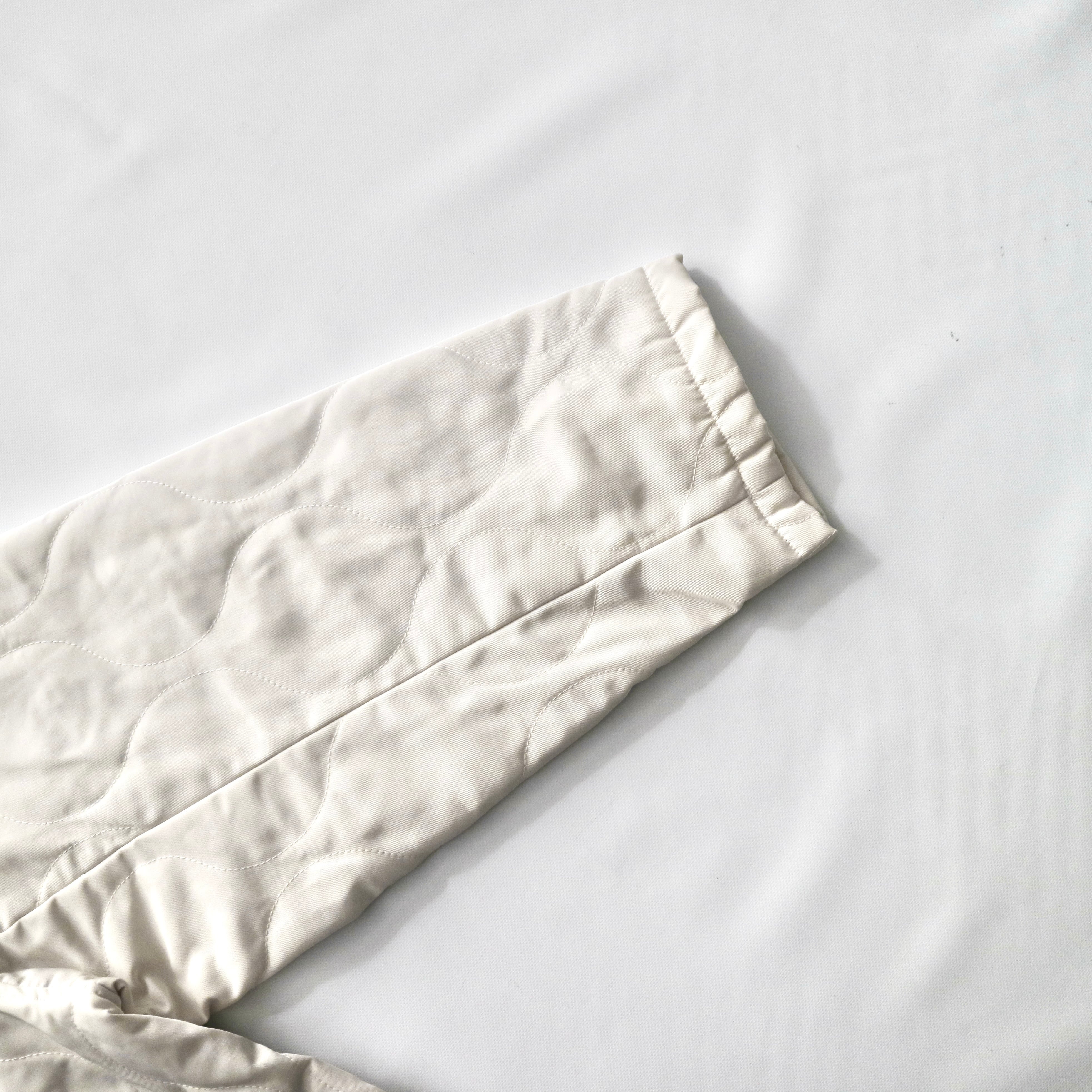 キルティングのデザインを施した、程良く光沢のあるポリエステル素材を使用したノーカラーコート。
