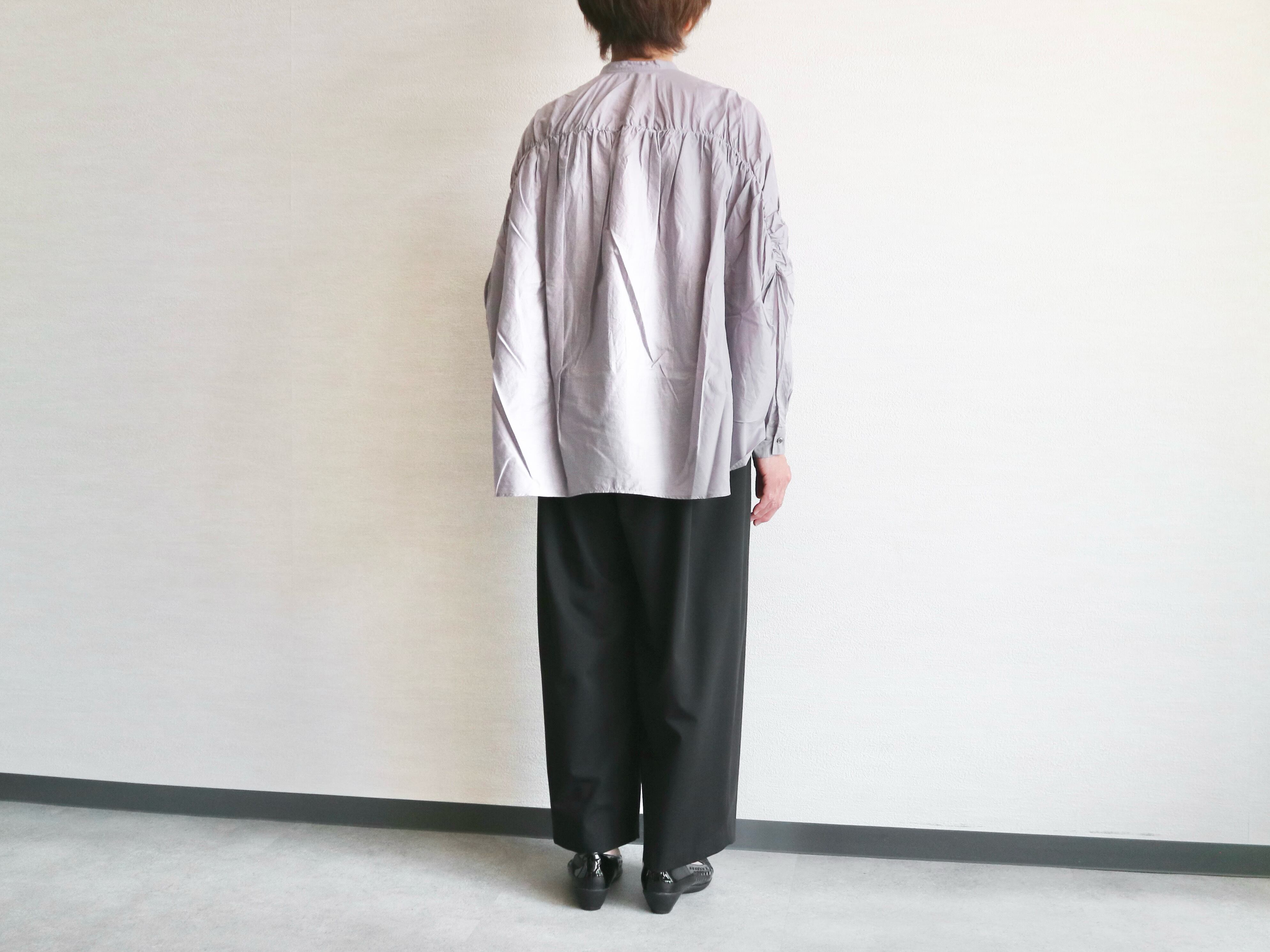 フロントはスタンドカラーですっきりとしたシンプルなデザインで、バックは肩から施したギャザーでふんわりとした女性らしいシルエットとなります。