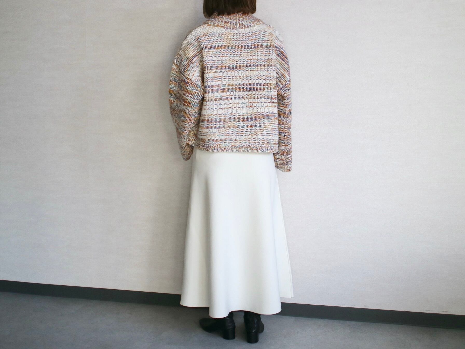 編み立てた時にランダムに色が移り変わる、かすり染めの糸と無地の太番手の糸を引き揃えて編み上げたハイネックニット。