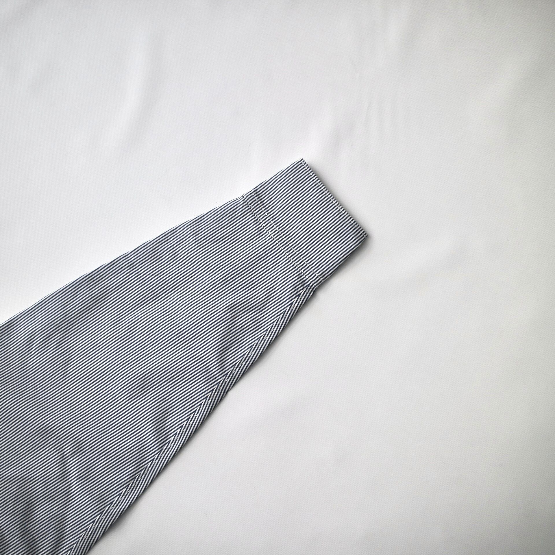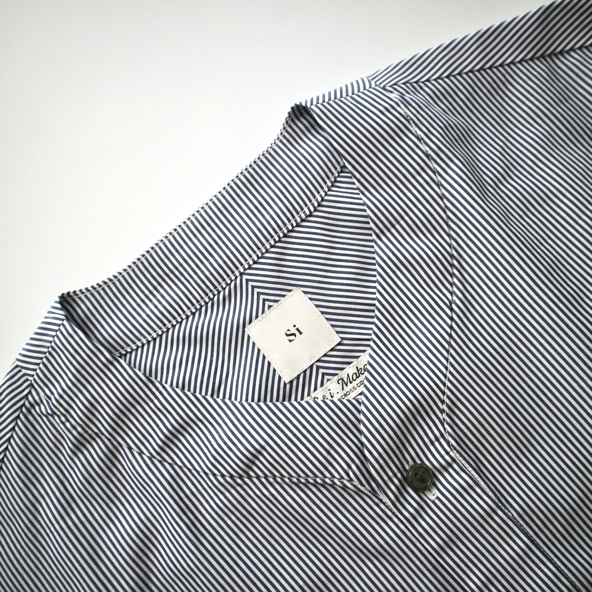 160番手の極細コーマ糸を双糸にし、高密度で織り上げたストライプ生地を使用したベースボールカラーシャツ。