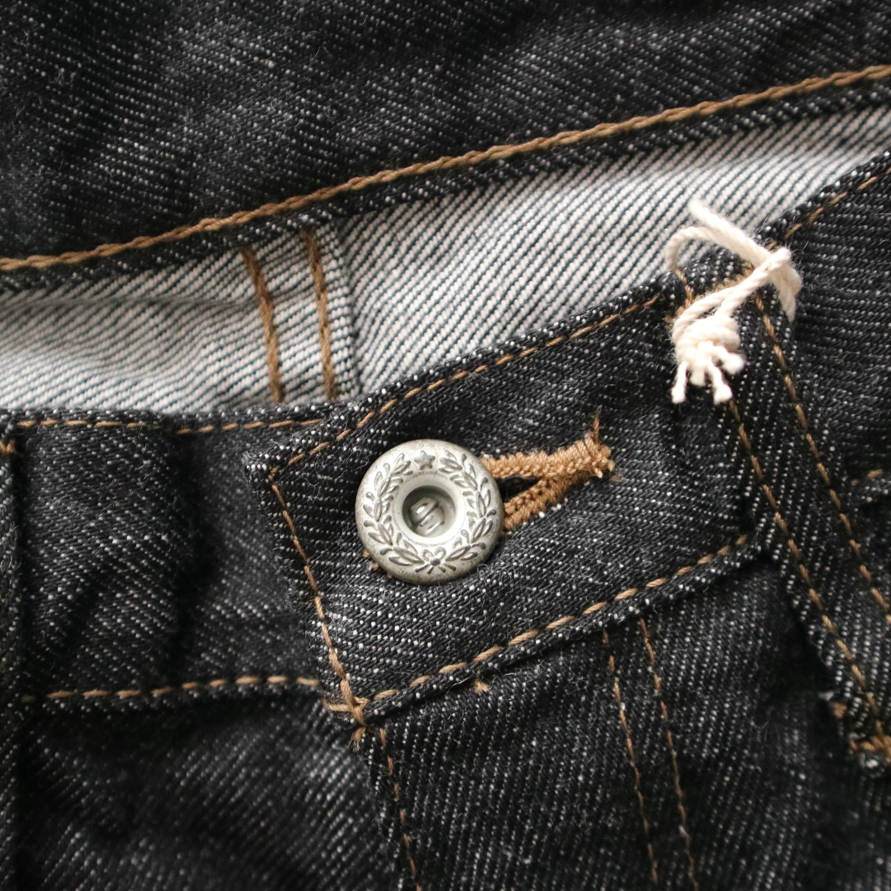シンプルな5ポケットデニムですが、ポケットの袋布はオリジナルのプリントスレーキを使用していたり、小ぶりな牛革のオリジナルパッチや月桂樹ボタンなど、細部にSancaらしい遊び心が効いたアイテムとなります。