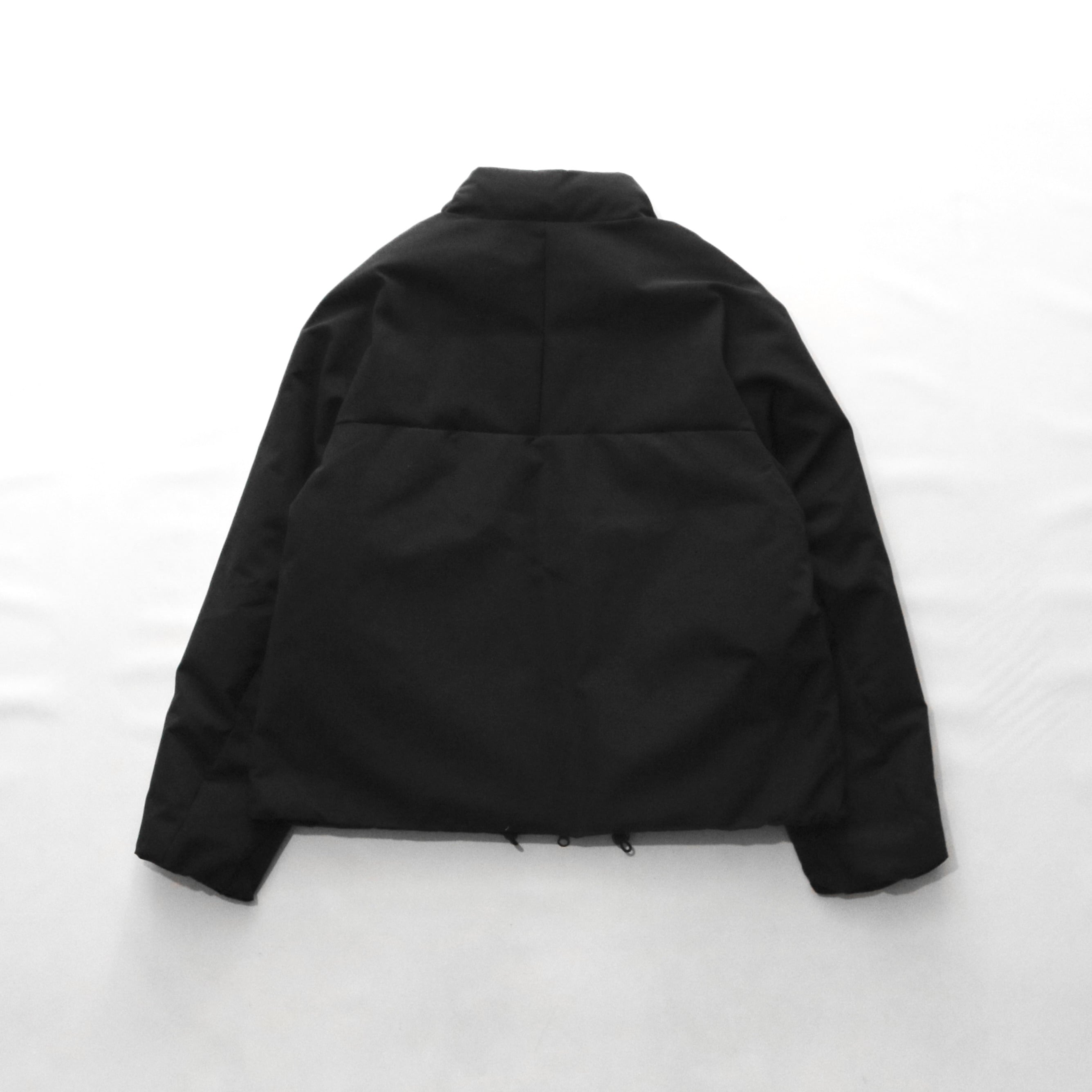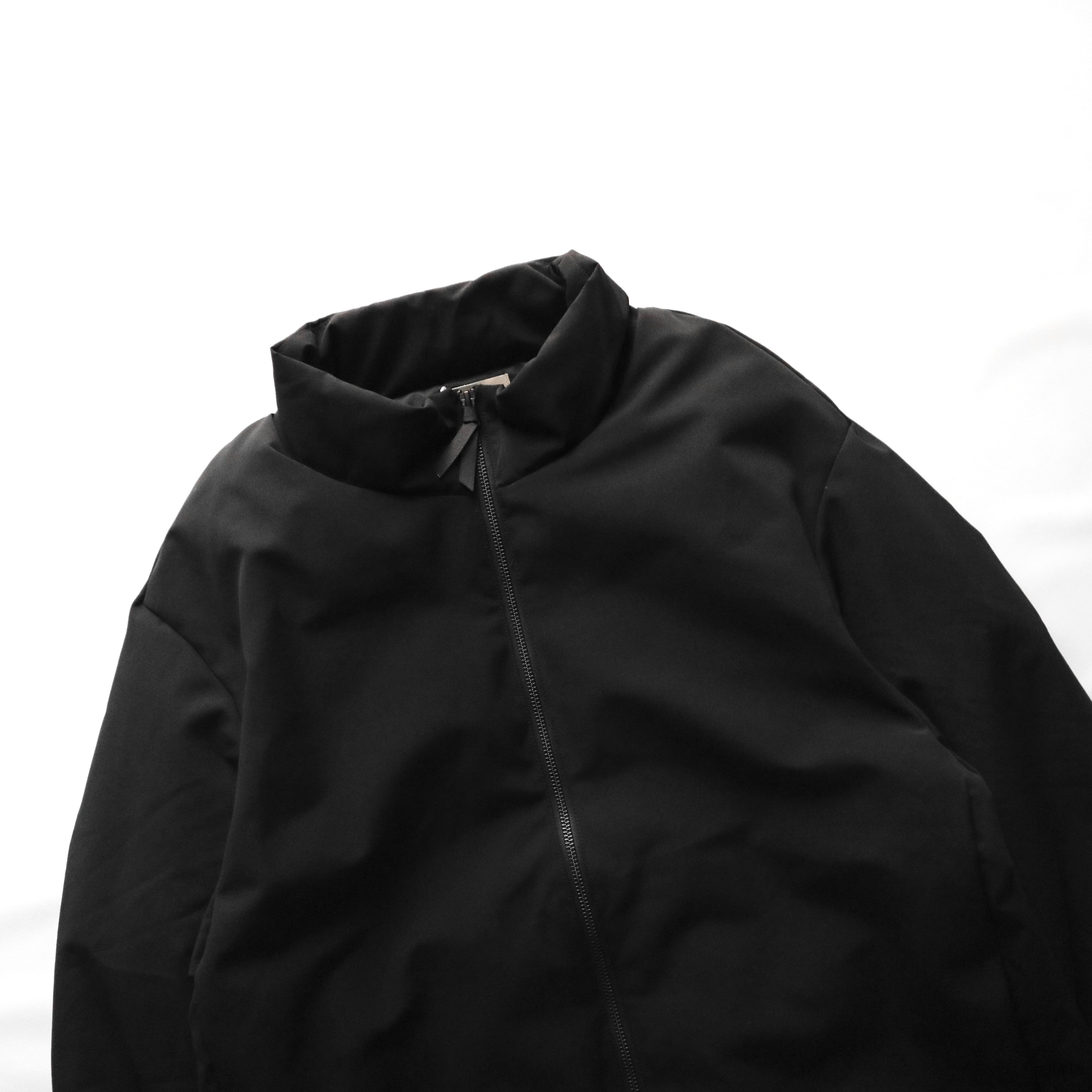 表地に高密度でハリがあり、撥水性にも優れたポリエステル/コットン素材を使用したスタンドカラーダウンブルゾン。